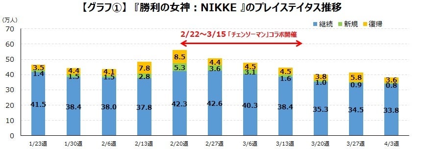 今回は、2022年11月、リリースと同時に100万人規模のアクティブユーザーを獲得した話題作『勝利の女神:NIKKE』(以下:『NIKKE』)が、リリースから3ヶ月後の2023年2月に実施した、TVアニメ「チェンソーマン」のコラボでユーザー数がどのように増加したのか、また、コラボで獲得したユーザーがどのように推移したのかを見てきます。