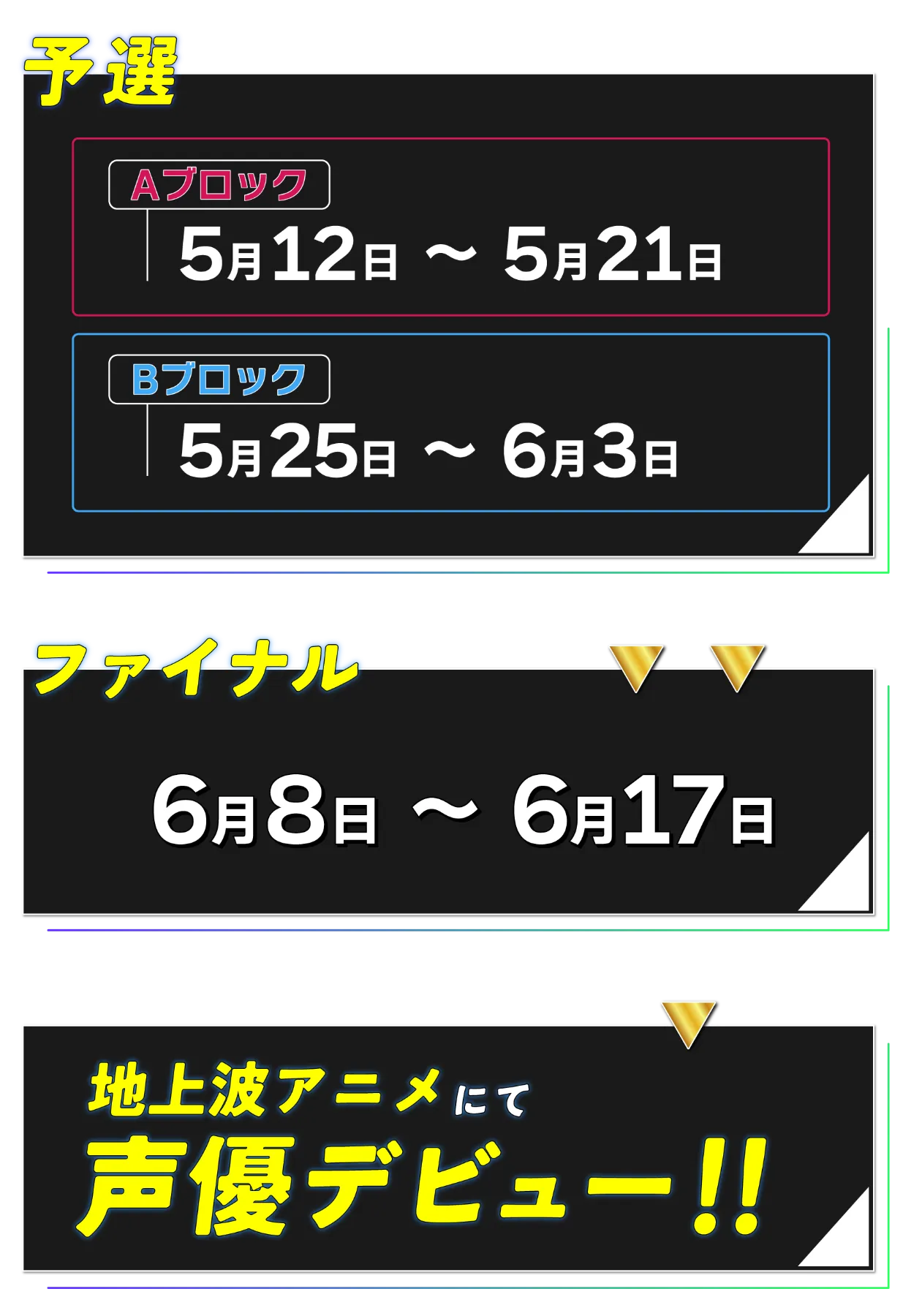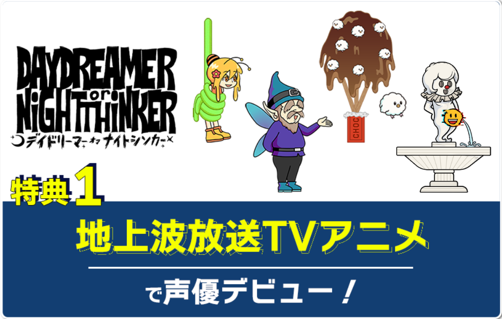オーディション合格者は、地上波TVアニメ『DAYDREAMER or NiGHTTHiNKER』で人気声優と共演し、声優デビューが決定しております。そのほか、声優雑誌「声優グランプリ(Web)」でのインタビュー掲載やボイストレーニングなど、声優として活動いただくための豪華特典をご用意しております。