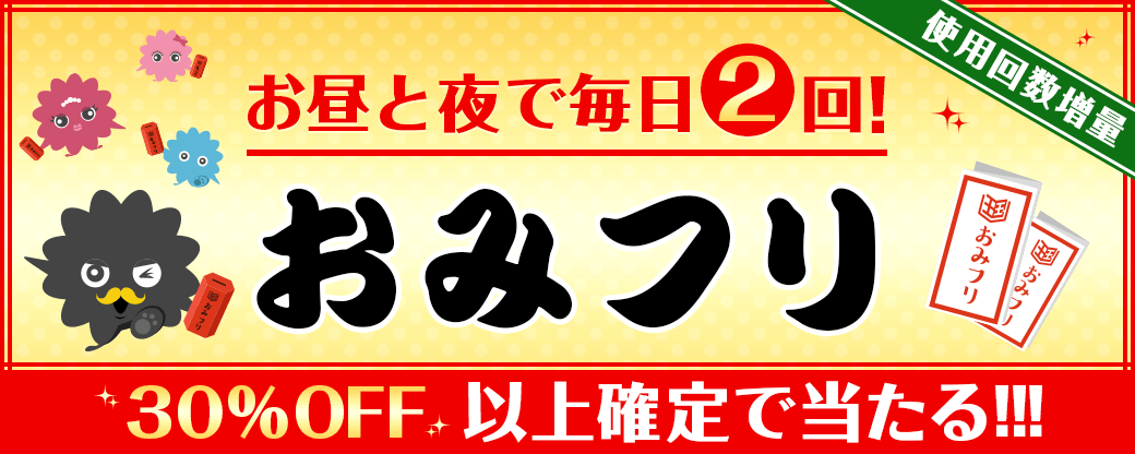 毎日2回振れるクーポンくじが、期間中はさらにお得に!ハズレなし、30%OFF以上が最大3回使えるクーポンが当たります。詳細は下記URLをご確認ください。