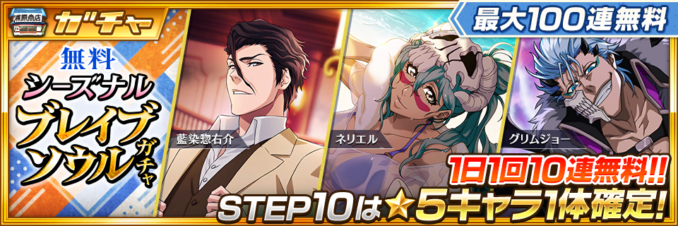 期間中、最大100連を無料で引ける「無料シーズナルブレイブソウルガチャ」を実施!