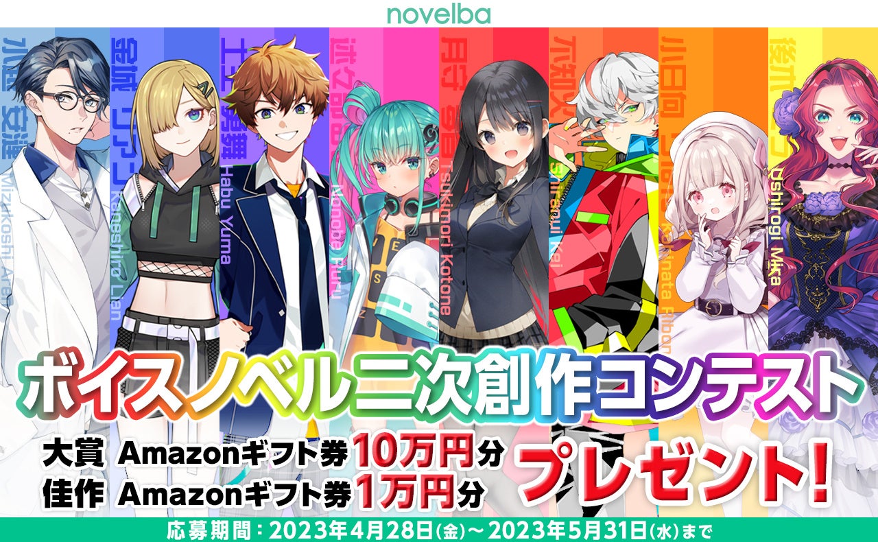 このたび、『ノベルバ』はボイスノベルコンテストの開催を決定いたしました。「ボイスノベル二次創作コンテスト」では、ノベルバ・ボイスノベルの公式キャラクター8人を対象にした二次創作作品を募集いたします。佳作を受賞した作品にはAmazonギフト券1万円分、大賞作品にはAmazonギフト券10万円分が贈られます。皆様のご応募をお待ちしております!