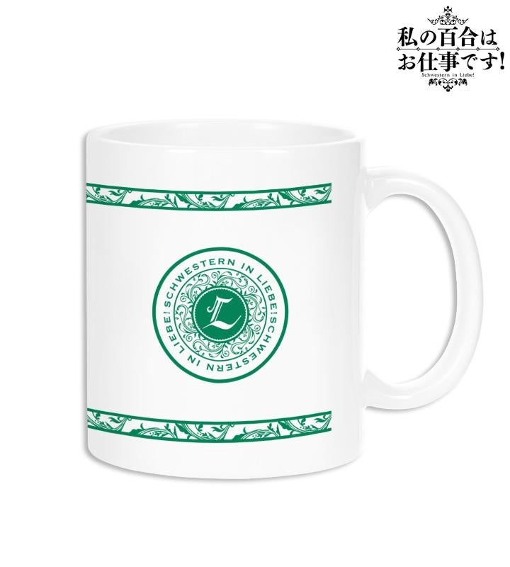 リーベ女学園のロゴをメインに、モチーフをレイアウトしたデザインのマグカップに仕上げました。