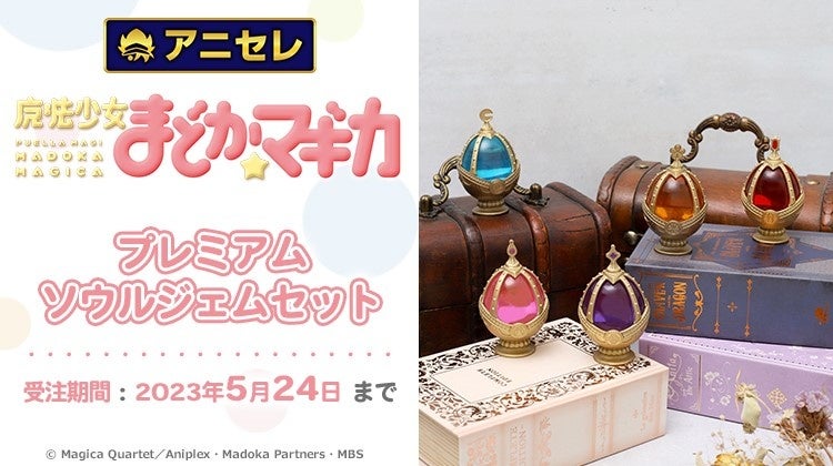 『animate LIMITED SELECTION(アニセレ)』とは、アニメ・コミック・ゲームの専門店「アニメイト」が様々なグッズメーカーと共同で商品を企画、アニメイトでしか手に入らない高品質な受注生産商品をお客様へお届けするプロジェクトです。2023年7月21日頃に発売を予定している『魔法少女まどか☆マギカ』の「プレミアムソウルジェムセット」は、作中のソウルジェムを忠実に再現した商品。ソウルジェムの美麗な輝き、フレームの細やかな造形、重厚感のあるたたずまいの逸品で、まどか、ほむら、マミ、さやか、杏子の5人のソウルジェムが、箔押しのボックスに収納されております。全国アニメイト・アニメイト通販にて、2023年5月24日まで受注受付を行っております。