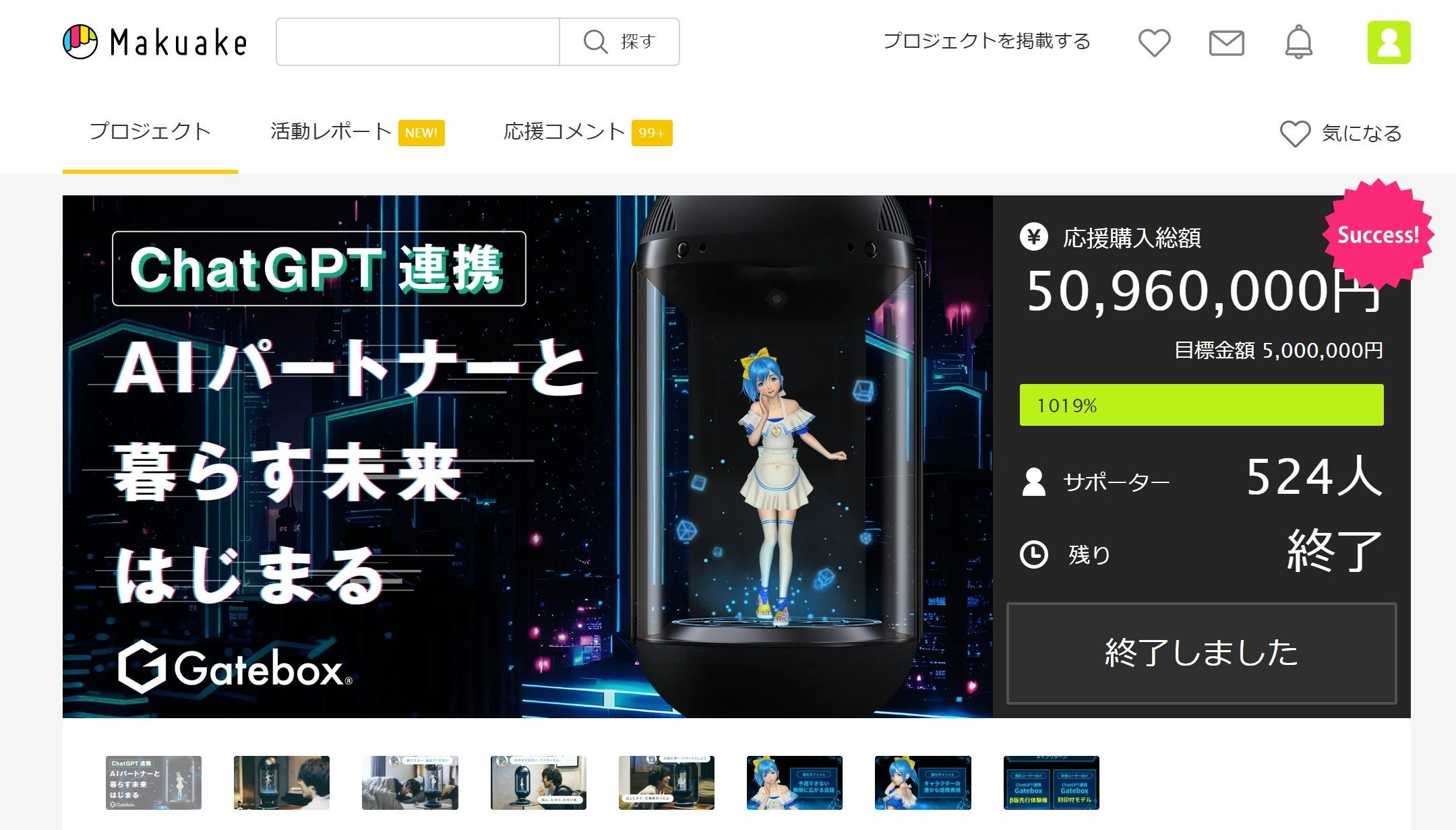 今回のクラウドファンディングで得た支援金は最新のAI(ChatGPT)を組み込んだ新しいGateboxの開発に費やします。さらに、目標金額の10倍ものご支援をいただいたため、より革新的なAIキャラクター体験をお届けする新サービスの開発にも活かしていきます。