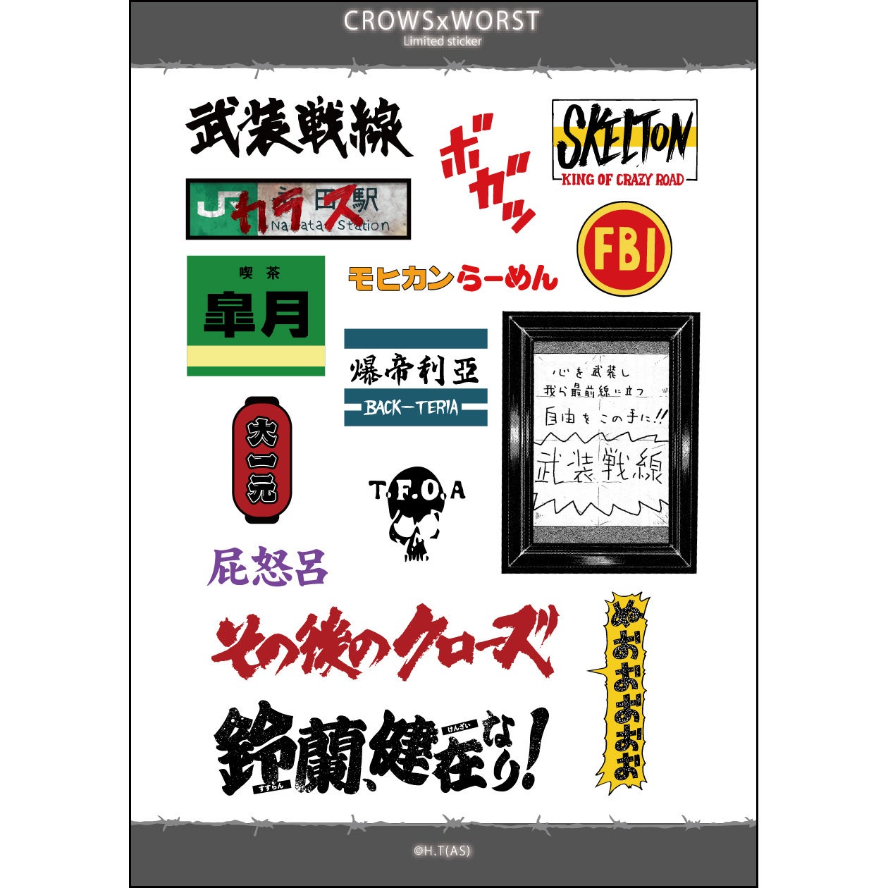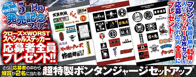 クローズ×WORST外伝5タイトル同時発売を記念して、クローズ×WORSTスペシャルステッカーが応募者全員にもれなくプレゼントされる特別キャンペーンを実施。「クローズ」「WORST」に登場したお馴染みのチームフラッグやロゴから、かな〜りマニアックなものまで、ファンなら納得の柄が45種も入ったステッカー3枚セット。ステッカー1枚の大きさはA6サイズ。