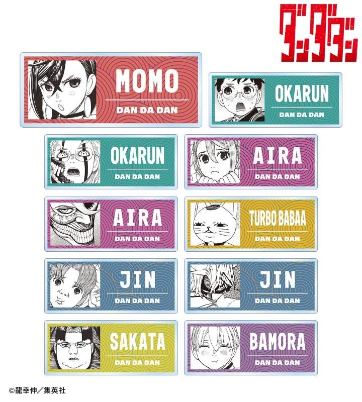 綾瀬 桃、オカルン、オカルン(変身)、白鳥 愛羅、白鳥 愛羅(変身)、ターボババア、円城寺 仁、円城寺 仁(変身)、坂田 金太、バモラのコマイラストをアクリルネームプレートに仕上げました。