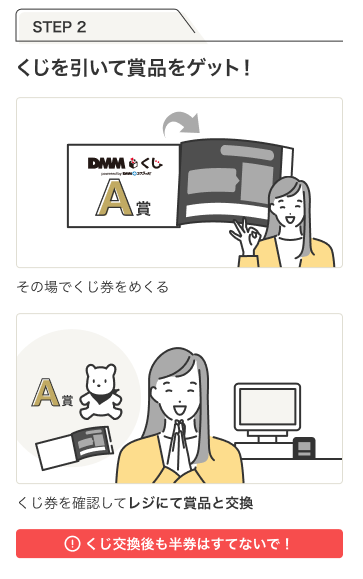 お好きなくじを購入していただくと当たったアイテムをその場で引き換えることができます。また、アイテムは全てDMMくじオリジナルのラインナップを展開する予定です。