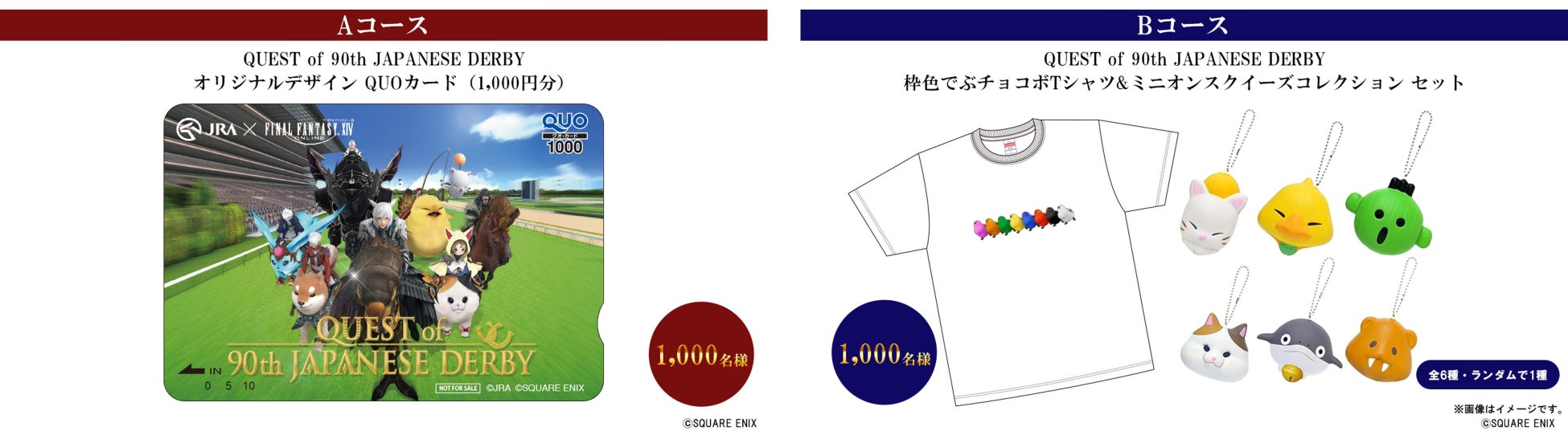 また、2023年5月27日(土)東京競馬場では、 「QUEST of 90th JAPANESE DERBY」コラボグッズが当たる抽選会を開催。勝馬投票券500円分以上(※馬券だけでなくUMACAの利用明細も対象 ※ネット投票は対象外)を提示いただくと抽選に参加いただけます。「JRA×FINAL FANTASY XIV QUEST of DERBY @SHINJUKU」で配布する「リーフレット」を掲示いただくと、さらにもう一回、抽選にご参加が可能です。