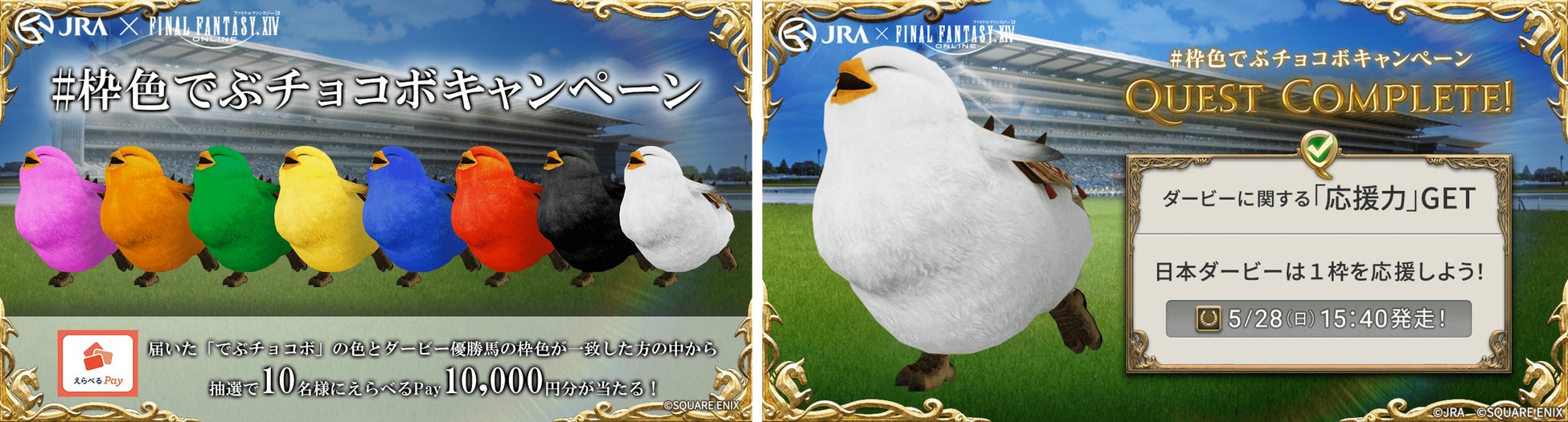 また、JRAFUN公式Twitterアカウントをフォロー&対象ツイートのリツイート後に届く画像「枠色でぶチョコボ」の色と、第90回 日本ダービーの優勝馬の枠色が一致した方の中から抽選で「えらべるPay10,000円分」をプレゼントする「#枠色でぶチョコボキャンペーン」も実施。さらに、2023年5月25日(木)~27日(土)の期間、新宿タカシマヤで、 『JRA×FINAL FANTASY XIV QUEST of DERBY@SHINJUKU』イベントを開催。イベント会場は、等身大の競走馬像&でぶチョコボと一緒に写真が撮れるフォトスポットや、クエストに挑戦してコラボグッズがGETできるスタンプラリーなど、『QUEST of 90th JAPANESE DERBY』の世界を体感していただける場となっております。