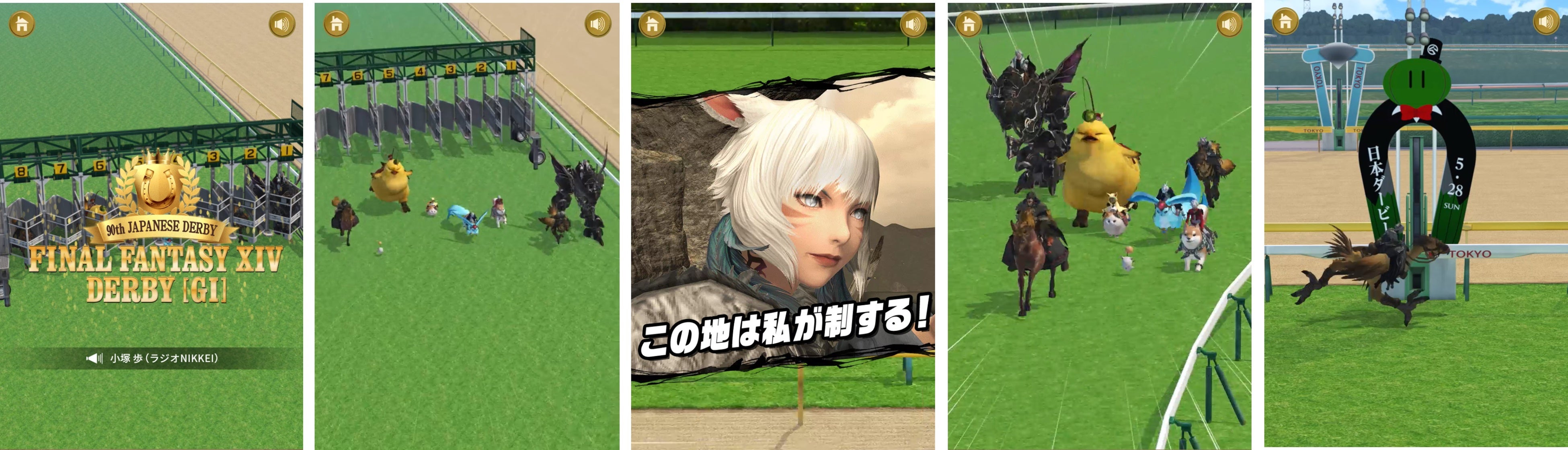 「ファイナルファンタジーXIV」のゲーム内に登場する人気キャラクターであるアルフィノや、アリゼー、サンクレッド、ヤ・シュトラたちがジョッキーとなり、チョコボや、魔導アーマーなど出走馬(マウント)に乗って、日本ダービーと同じコースを爆走し、コラボならではのスペシャルレースを楽しみながら1着を予想するゲームとなっております。