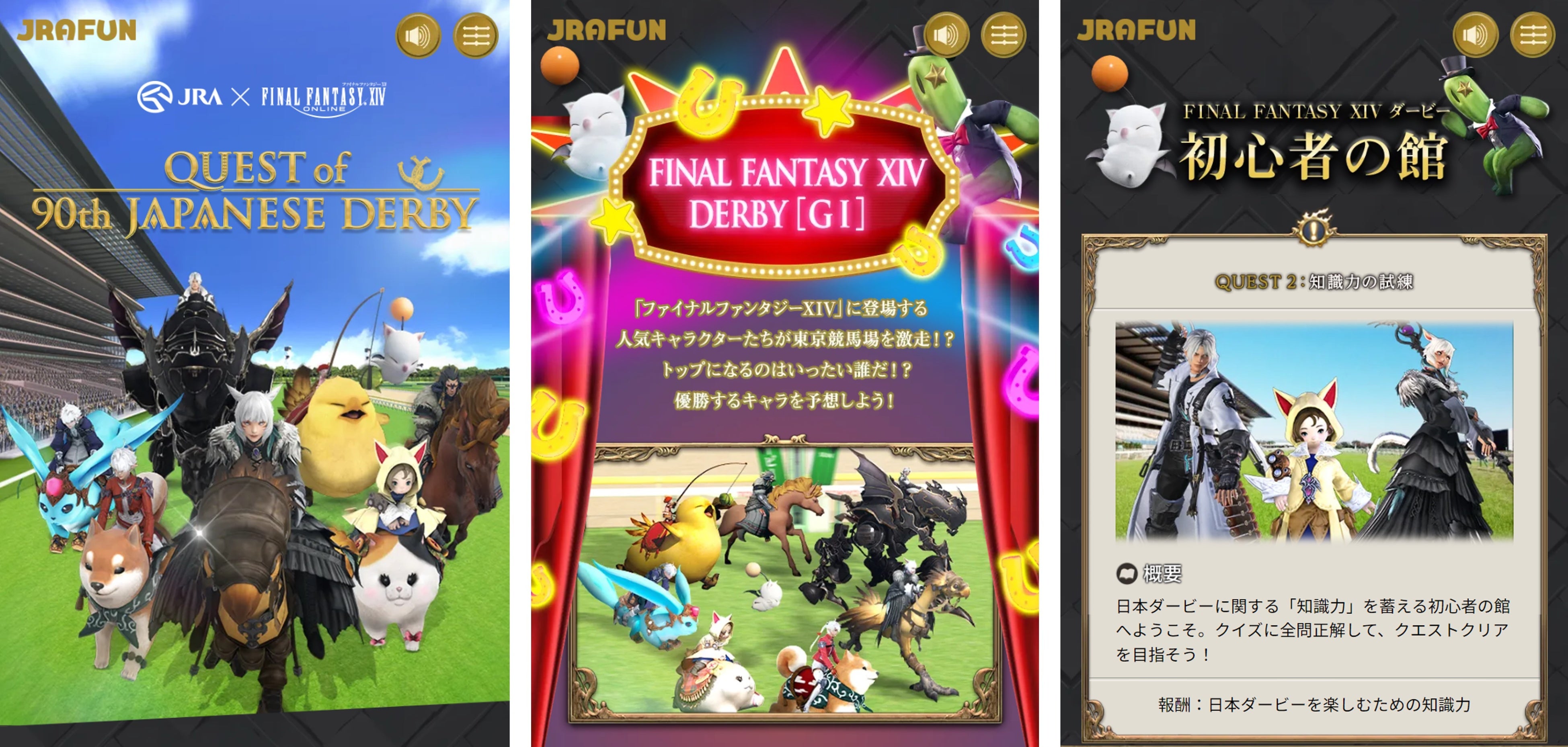 『QUEST of 90th JAPANESE DERBY』では、「ファイナルファンタジーXIV」のゲーム内に登場する人気キャラクターであるアルフィノや、アリゼー、サンクレッド、ヤ・シュトラたちがジョッキーとなり、チョコボや、魔導アーマーなどの出走馬(マウント)に乗って、日本ダービーと同じコースを爆走し、コラボならではのスペシャルレースを楽しみながら1着を予想するゲーム「FINAL FANTASY XIV DERBY(GⅠ)」や、 「ファイナルファンタジーXIV」の人気キャラクターたちとともに出題される、競馬の基礎知識や日本ダービーに関するクイズにチャレンジし、日本ダービーを楽しむための知識力獲得を目指す「FINAL FANTASY XIV ダービー 初心者の館」など、多くのスペシャルコンテンツを楽しむことができます。