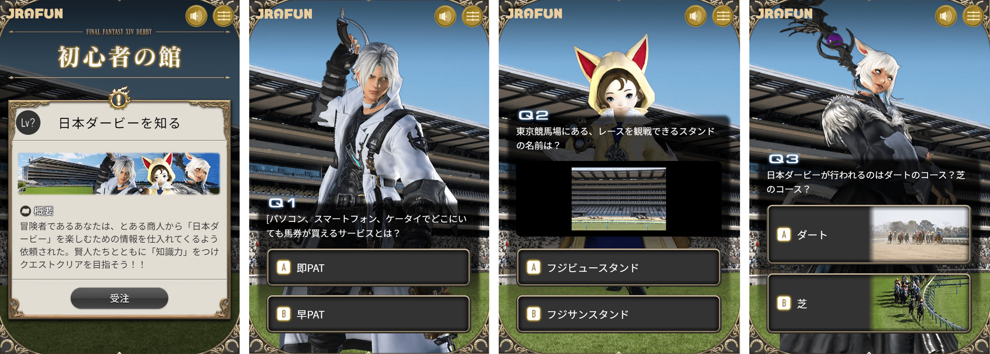 「ファイナルファンタジーXIV」のキャラクターたちとともに出題される、競馬の基礎知識や日本ダービーに関するクイズにチャレンジするクイズコンテンツです。日本ダービーを楽しむための知識力獲得を目指し、全問正解するまで何度もトライしましょう!