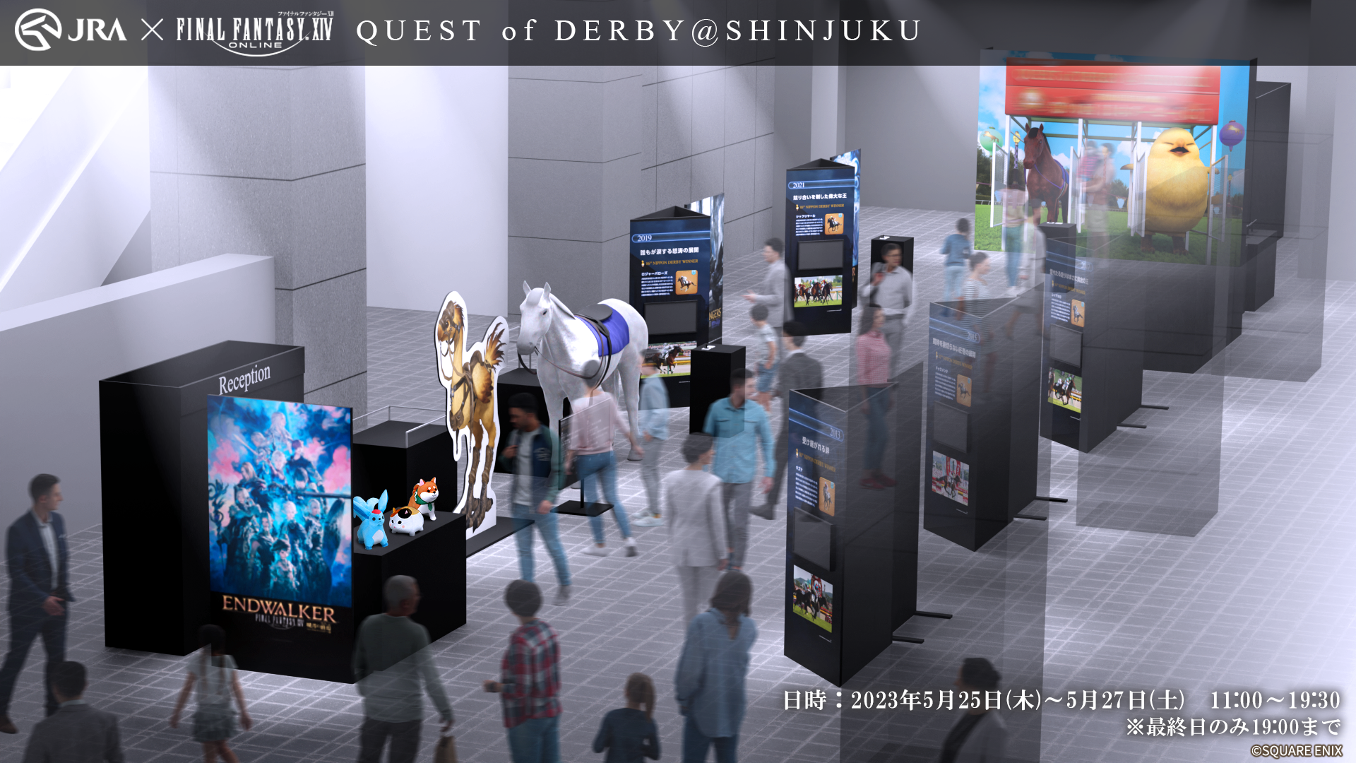 2023年5月25日(木)~27日(土)の期間、新宿タカシマヤで、 『JRA×FINAL FANTASY XIV QUEST of DERBY @SHINJUKU』イベントを開催。イベント会場では、等身大の競走馬像&でぶチョコボと一緒に写真が撮れるフォトスポットや、クエストに挑戦してコラボグッズがGETできるスタンプラリーなど、『QUEST of 90th JAPANESE DERBY』の世界を体感していただける場となっております。