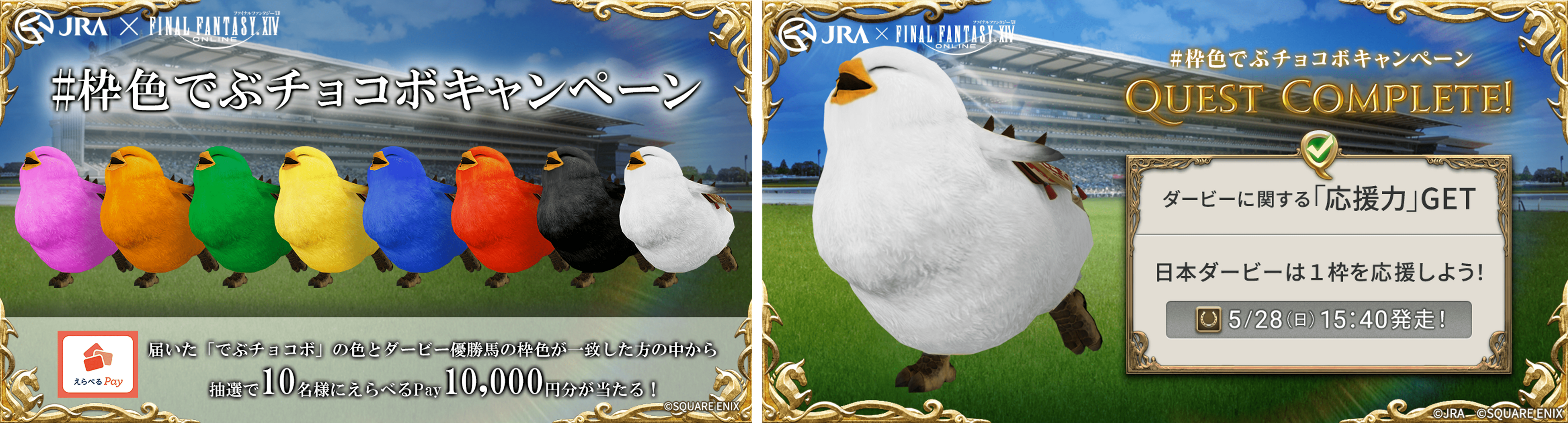 また、JRAFUN公式Twitterアカウントをフォロー&対象ツイートのリツイート後に届く画像「枠色でぶチョコボ」の色と、第90回 日本ダービーの優勝馬の枠色が一致した方の中から抽選で「えらべるPay10,000円分」をプレゼントする「#枠色でぶチョコボキャンペーン」も実施。さらに、2023年5月25日(木)~27日(土)の期間、新宿タカシマヤで、 『JRA×FINAL FANTASY XIV QUEST of DERBY@SHINJUKU』イベントを開催。イベント会場は、等身大の競走馬像&でぶチョコボと一緒に写真が撮れるフォトスポットや、クエストに挑戦してコラボグッズがGETできるスタンプラリーなど、『QUEST of 90th JAPANESE DERBY』の世界を体感していただける場となっております。