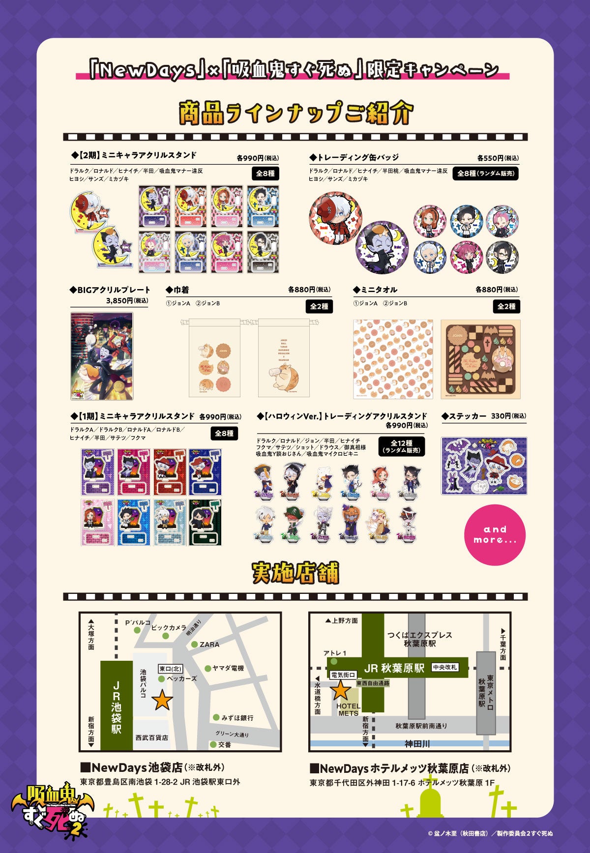 上記2店舗のNewDaysで「吸血鬼すぐ死ぬ」のグッズを2,000円(税込)お買い上げ毎に、NewDays限定ポストカードがランダムで1枚もらえます。(※1会計につき最大5枚まで ※絵柄はお選びいただけません。)