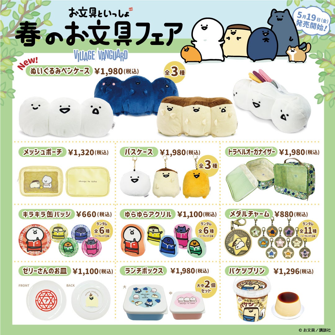 株式会社ヴィレッジヴァンガードコーポレーション(所在地:愛知県名古屋市、代表取締役社長:白川篤典)では、「お文具といっしょ」のグッズを集めた『春のお文具フェア』の開催を決定いたしました。ヴィレッジヴァンガード店舗では2023年5月19日(金)より販売を開始し、オンラインストアでは2023年5月12日(金)より先行販売を開始いたします。