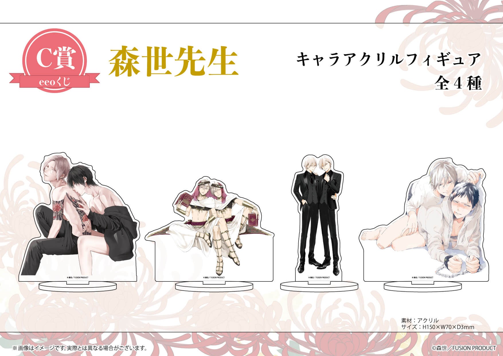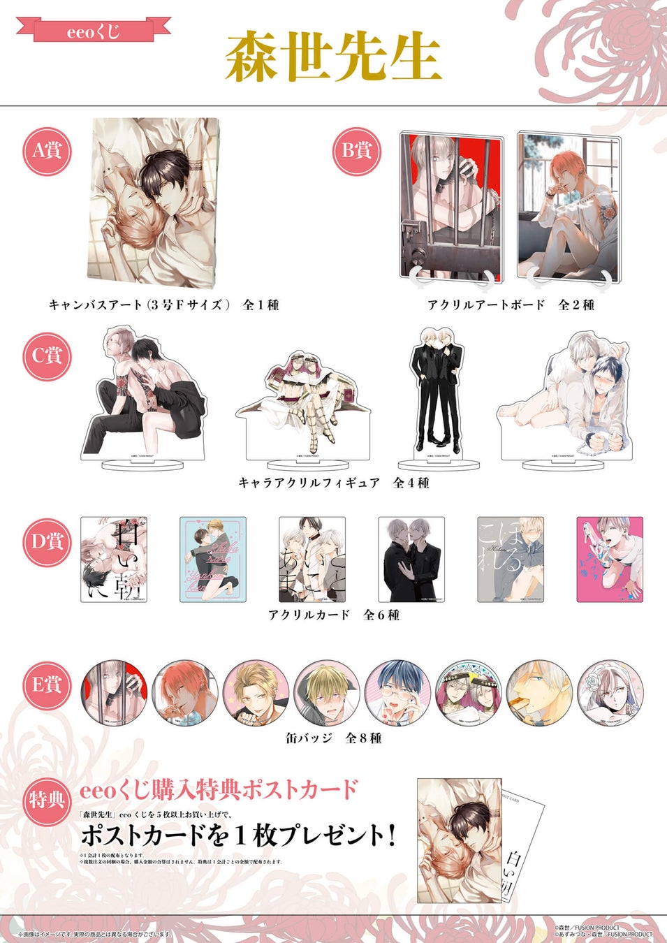 5月12日よりeeo Store(通販)にて発売され、森世先生が手がけるBL漫画9作品の美麗アイテムが豪華景品として当たります。