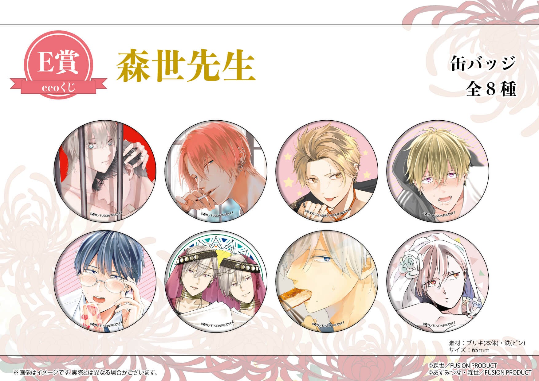 E賞は、存在感のある直径6.5cmの大きめ缶バッジ。『しばられヤンキーくん』『恋するあさはか』『男子、隣人と食せよ』など、“森世先生ワールド”を味わい尽くせる贅沢なラインナップにゾワゾワ&キュンキュン間違いなしです!