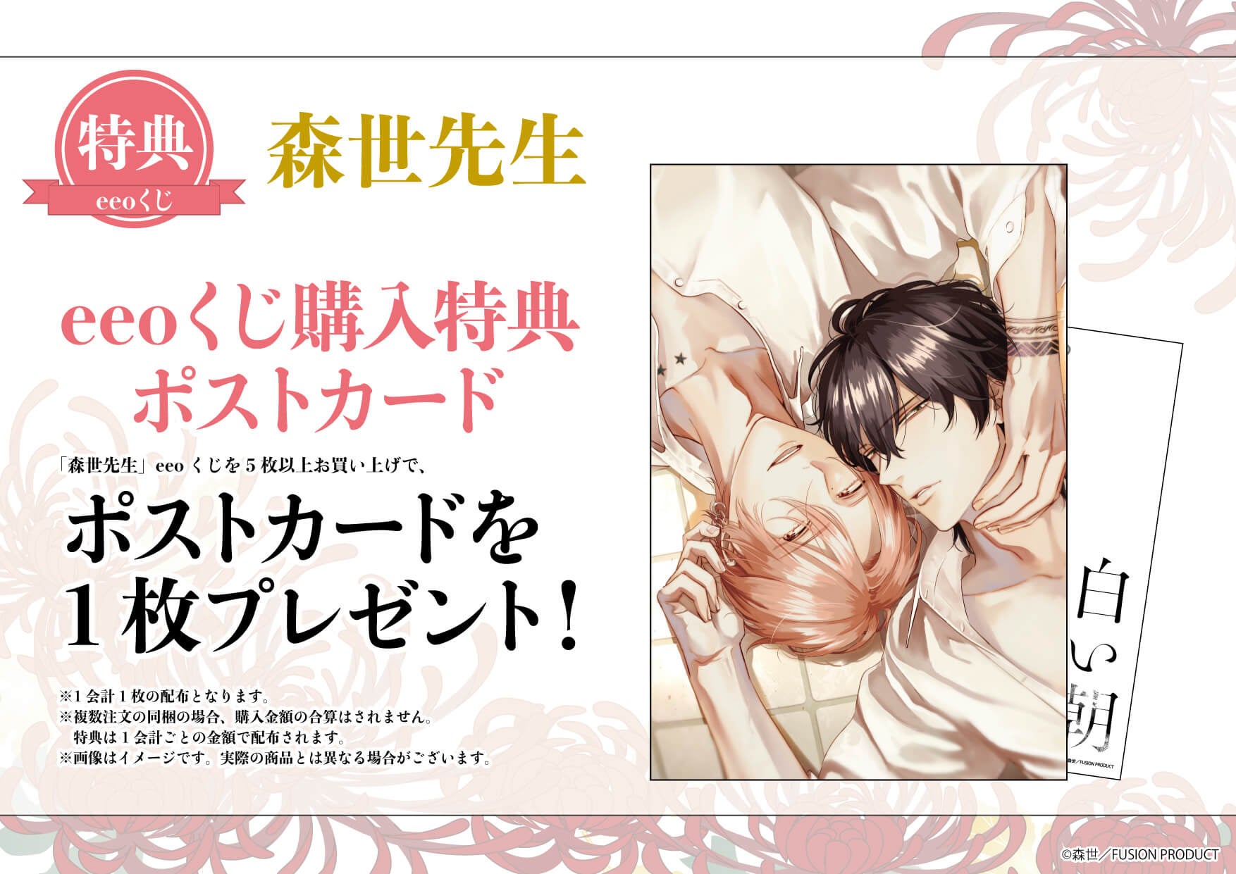 「森世先生作品」の「eeoくじ」を5枚以上お買い上げで、特典ポストカードを1枚プレゼント。『白い朝に』の新規描き下ろしイラストを使用した、ここでしか手に入らない限定品です。