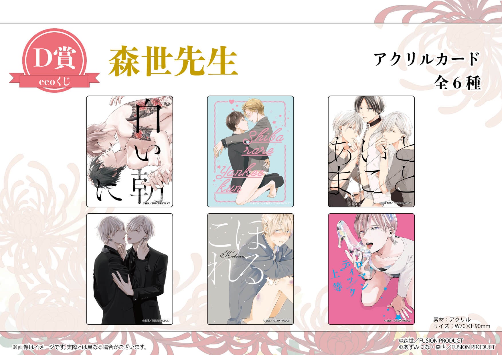 5月12日よりeeo Store(通販)にて発売され、森世先生が手がけるBL漫画9作品の美麗アイテムが豪華景品として当たります。