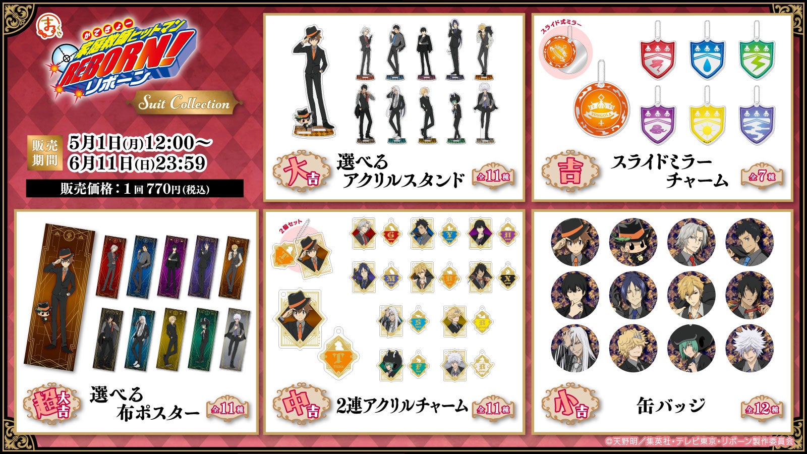 今回は『家庭教師ヒットマンREBORN!』のキャラクター達の「スーツ姿」をテーマとした描き下ろしイラストを使用し、『まるくじ』でしか手に入らない限定商品をご用意いたしました。