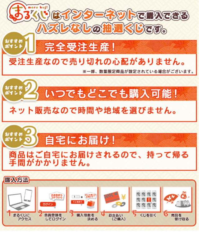 『まるくじ』はインターネットで購入できるハズレなしの抽選くじサービスです。各アイテムがすべて受注生産なので売り切れの心配はありません。(※)