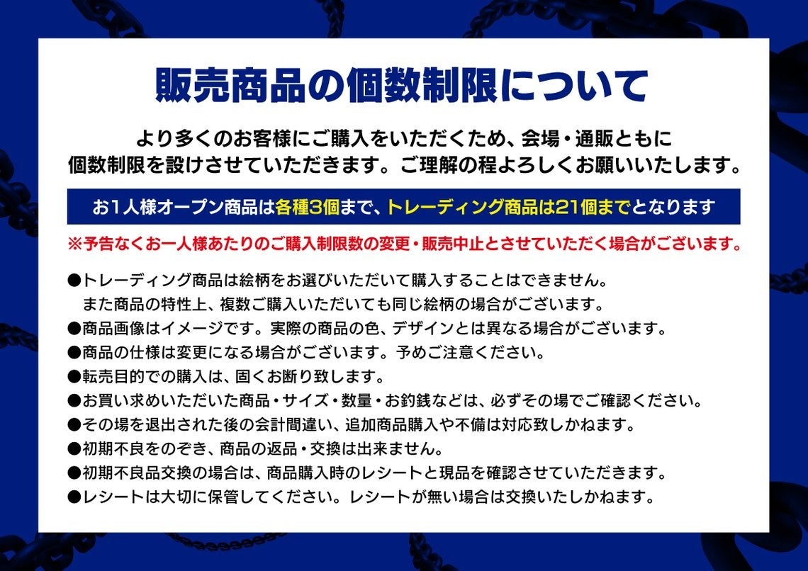【個数制限】お一人様オープン商品は3個まで、トレーディング商品は21個まで購入可能です。