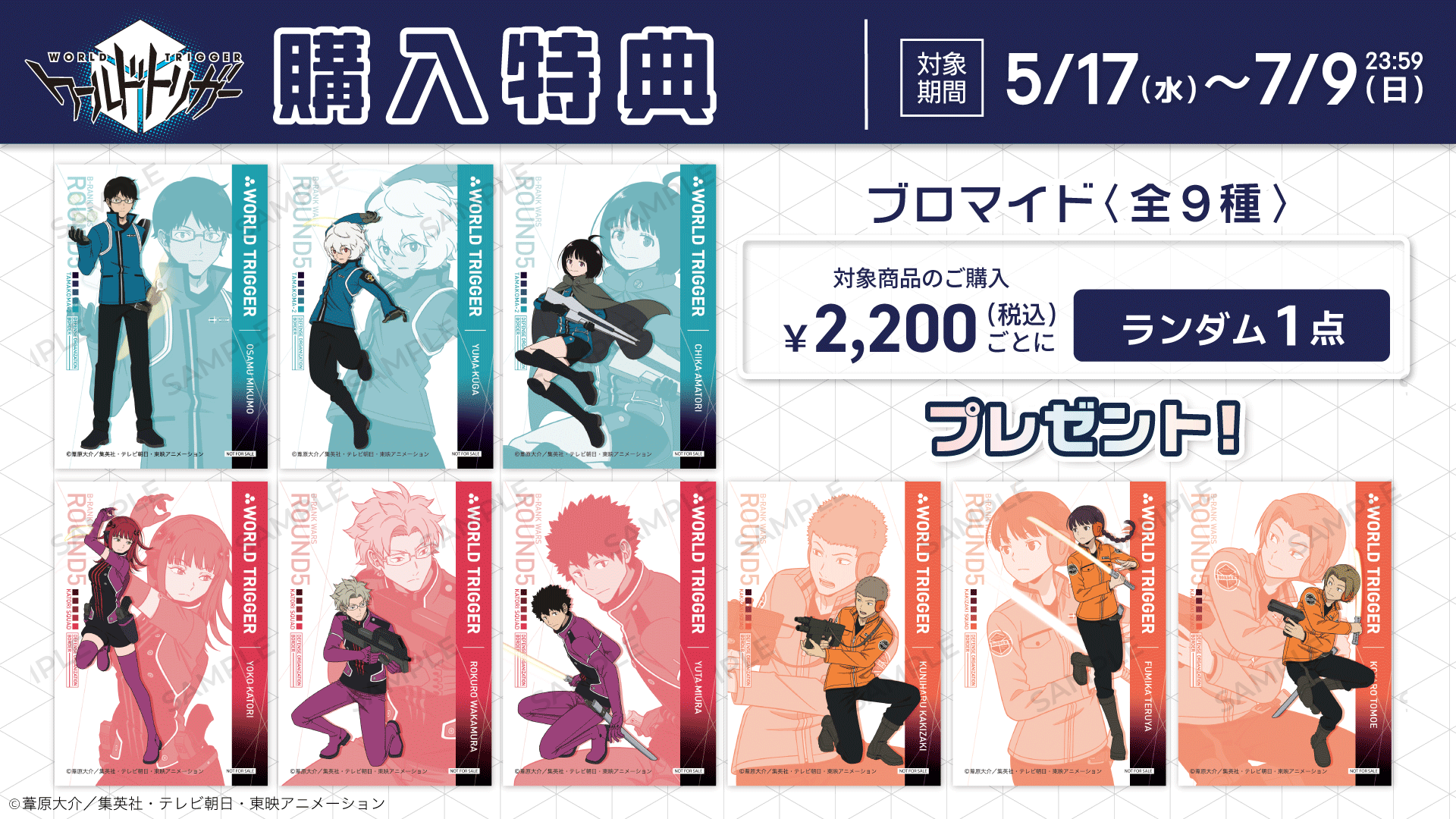 販売期間中(2023/5/17~7/9)、アニメ『ワールドトリガー』の合計注文金額2,200円(税込)お買い上げごとにランダムで特典ブロマイド(全9種)を1点プレゼントいたします。