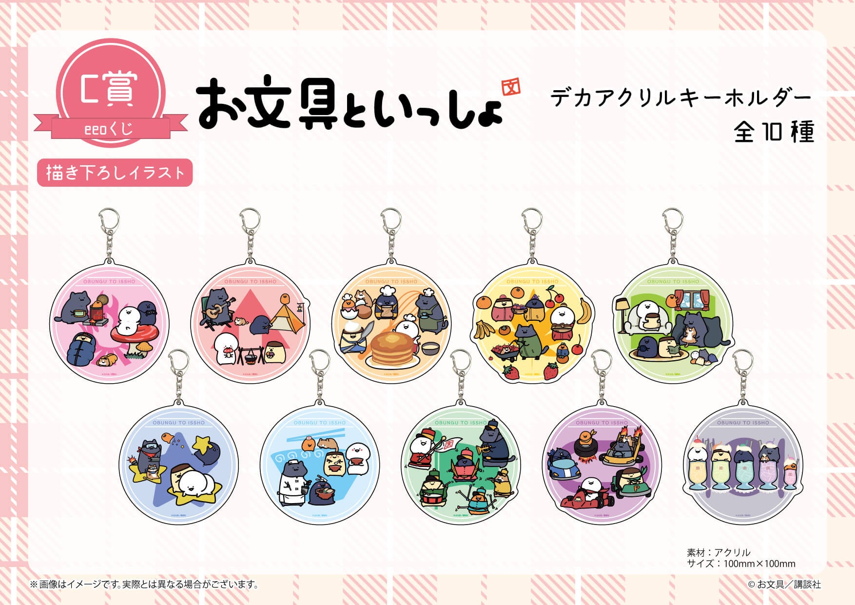 C賞は、10×10cmのデカアクリルキーホルダー。「お文具さんたちとお部屋」「ラーメン」「鼓笛隊」などをテーマにした描き下ろしイラストが、色とりどりに“どデカく”描かれています。