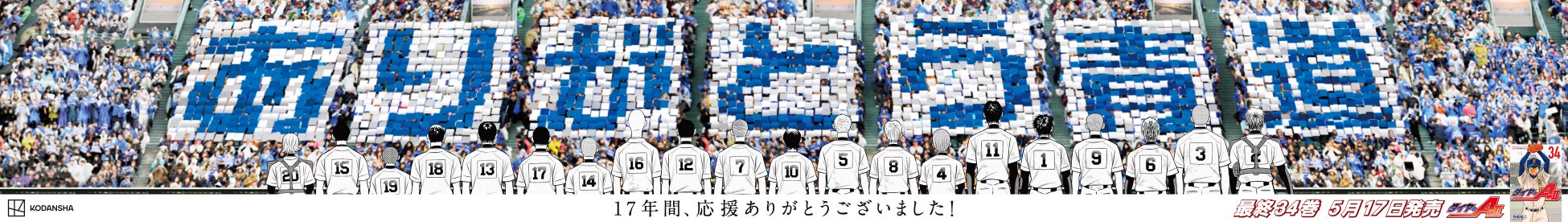東京メトロ新宿駅 改札横通路の大型ポスターに『ダイヤのA』に登場した球児たちの熱い背中が掲出されています。彼らの先には観客からの「ありがとう青道」の人文字が…。17年間という長きにわたり、たくさんのファンに支えられてきた感謝の気持ちをこめて。