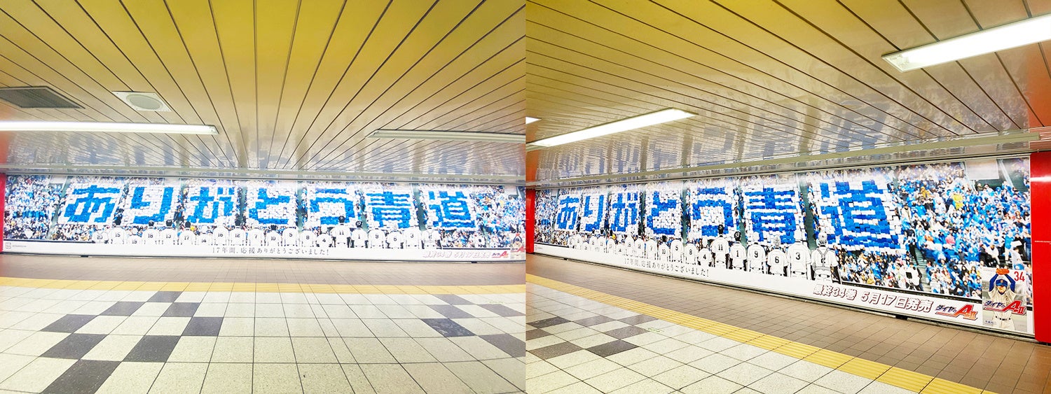 東京メトロ新宿駅 改札横通路の大型ポスターに『ダイヤのA』に登場した球児たちの熱い背中が掲出されています。彼らの先には観客からの「ありがとう青道」の人文字が…。17年間という長きにわたり、たくさんのファンに支えられてきた感謝の気持ちをこめて。
