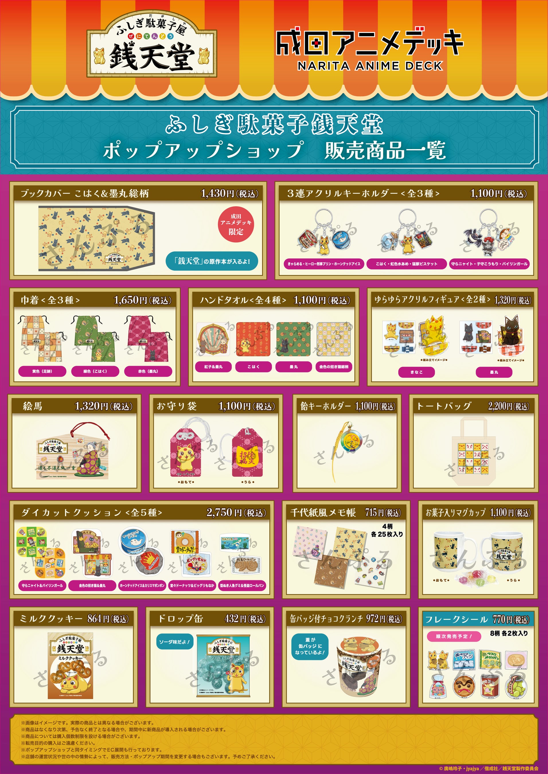 この会場でしか手に入らないポップアップショップ限定の「銭天堂」原作本が入るブックカバーを成田アニメデッキ版、ダ・ヴィンチストア&九州アニメデッキ版の2種類販売。その他、3連アクリルキーホルダー、ダイカットクッション、巾着、缶バッジ付チョコクランチなどの販売を行います。