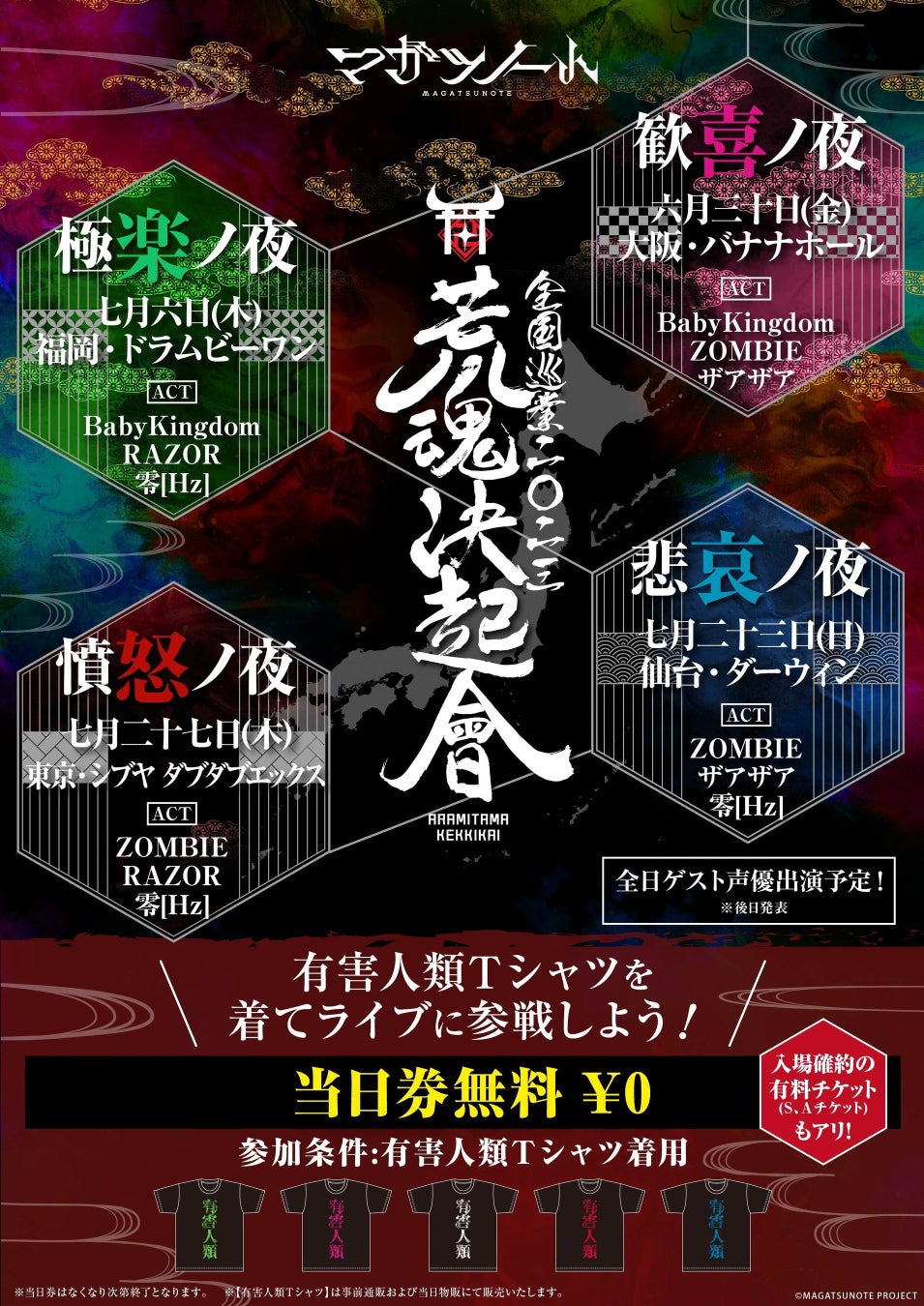 「荒魂決起會」の入場・観覧にはマガツノート公式グッズ【有害人類Tシャツ】いずれかの着用が必要です。整列時または入場時にスタッフが着用を確認いたします。