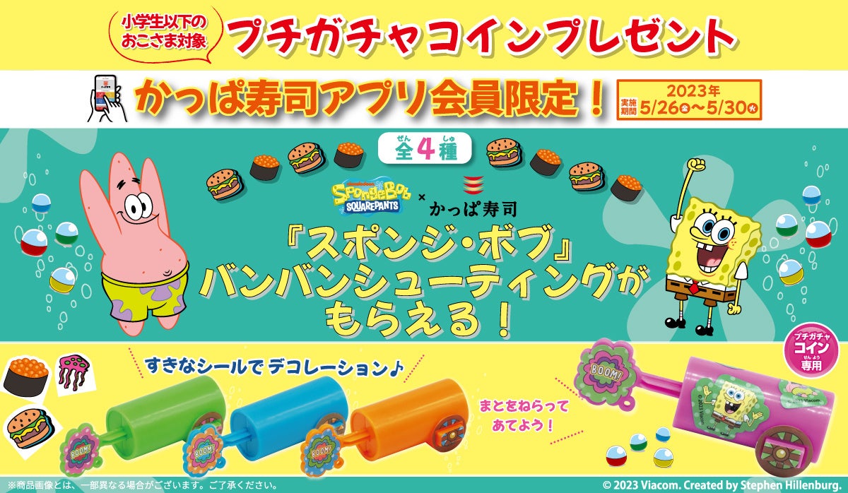 ぜひ、この機会にかっぱ寿司でご家族やご友人とのお食事をお楽しみいただき、『スポンジ・ボブ』のおもちゃ「バンバンシューティング」を手に入れてください。