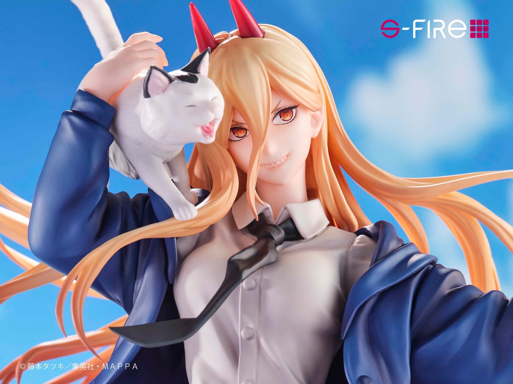 おなじみのハンマー片手に「ニャーコ」を連れた、完全オリジナルシチュエーションにて立体化しました。パワーらしい好戦的な表情に、舞い上がった髪の毛、立体的なディティールを施した衣服など、細部に至るまで造形にこだわりました。血の武器ならではの質感を重視した彩色表現で、「S-FIRE(エスファイア)」のこだわりをしっかりと詰め込んでおります。