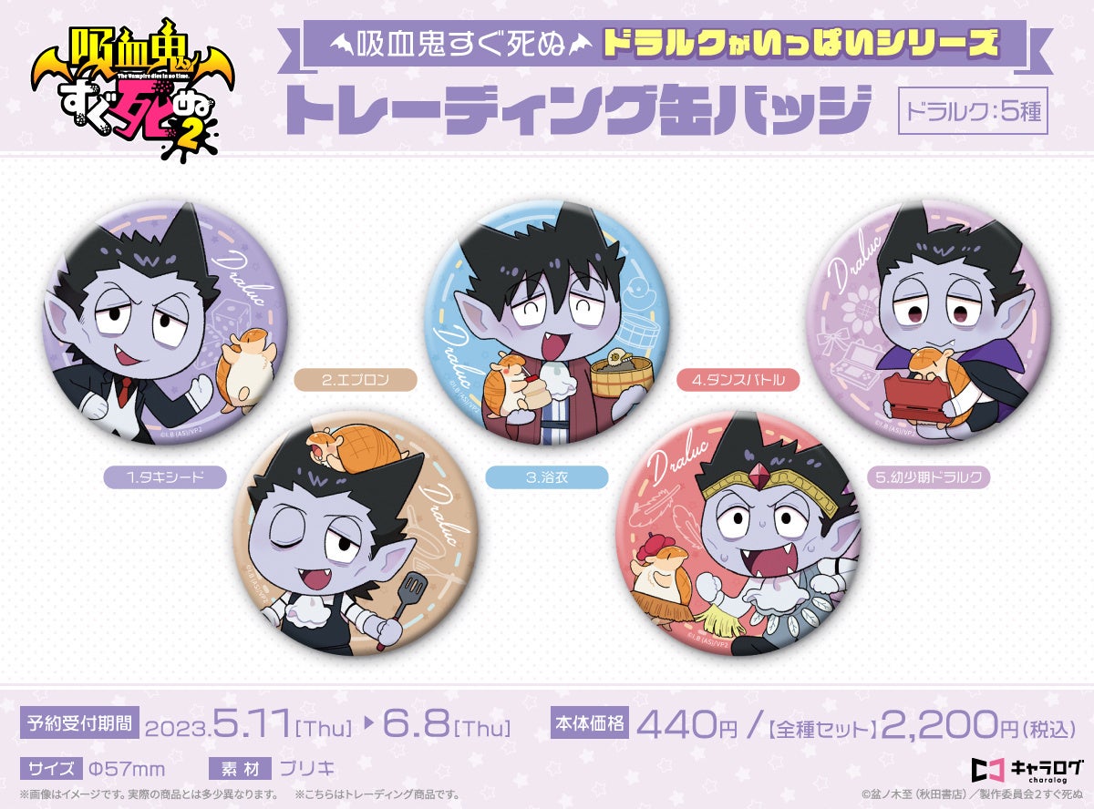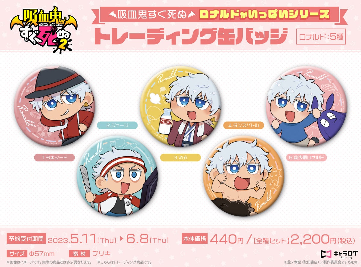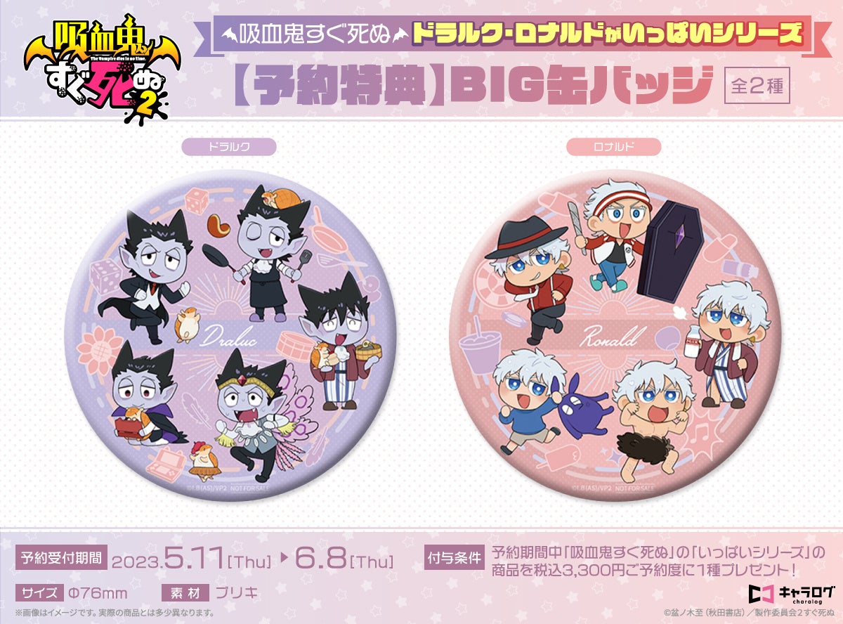 予約期間中、キャラログにてアニメ『吸血鬼すぐ死ぬ』の「いっぱいシリーズ」商品を3,300 円(税込 / 送料除く)ご予約毎に、特典缶バッジ全2種のうち 1 種をプレゼント!