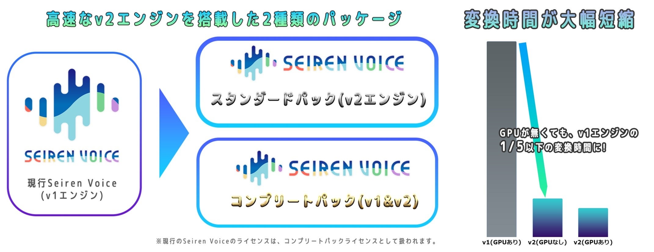 今後、v2音声ライブラリに対応した「Seiren Voice」においては、音声ライブラリv1とv2を両方利用できる「Seiren Voice コンプリートパック (v1&v2)」(価格:17,600円)とv2のみが利用可能な「Seiren Voice スタンダードパック (v2)」(価格:14,300円)を販売します。また、これまでのSeiren Voiceを購入した既存ユーザーのライセンスは、「Seiren Voice コンプリートパック (v1&v2)」のライセンスとして扱われ、v2音声ライブラリが公開され次第、無償で利用できるようになります。