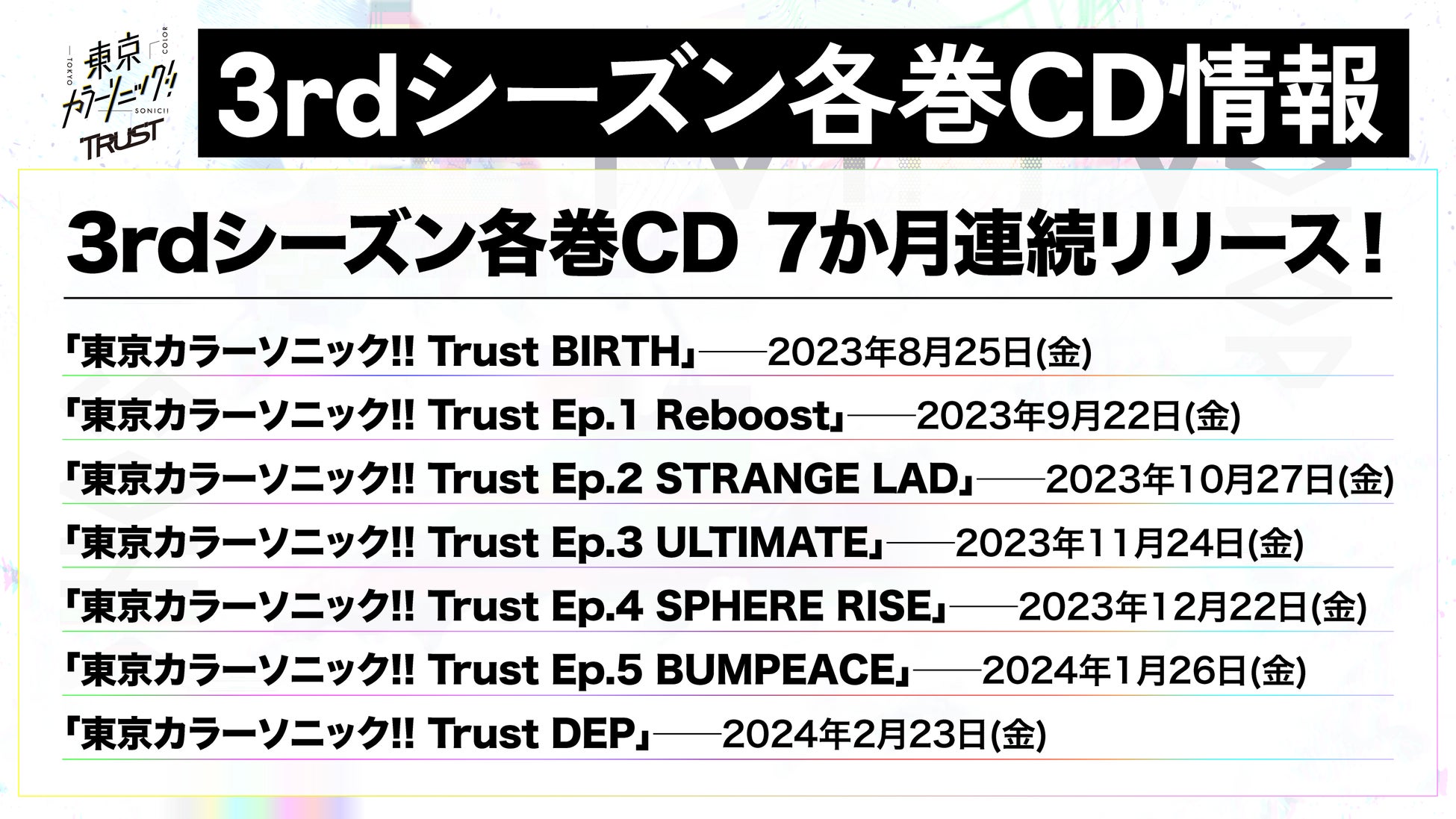 3rdシーズン『東京カラーソニック!! Trust』では、2023年8月から2024年2月までの7か月連続でCDのリリースが決定!
