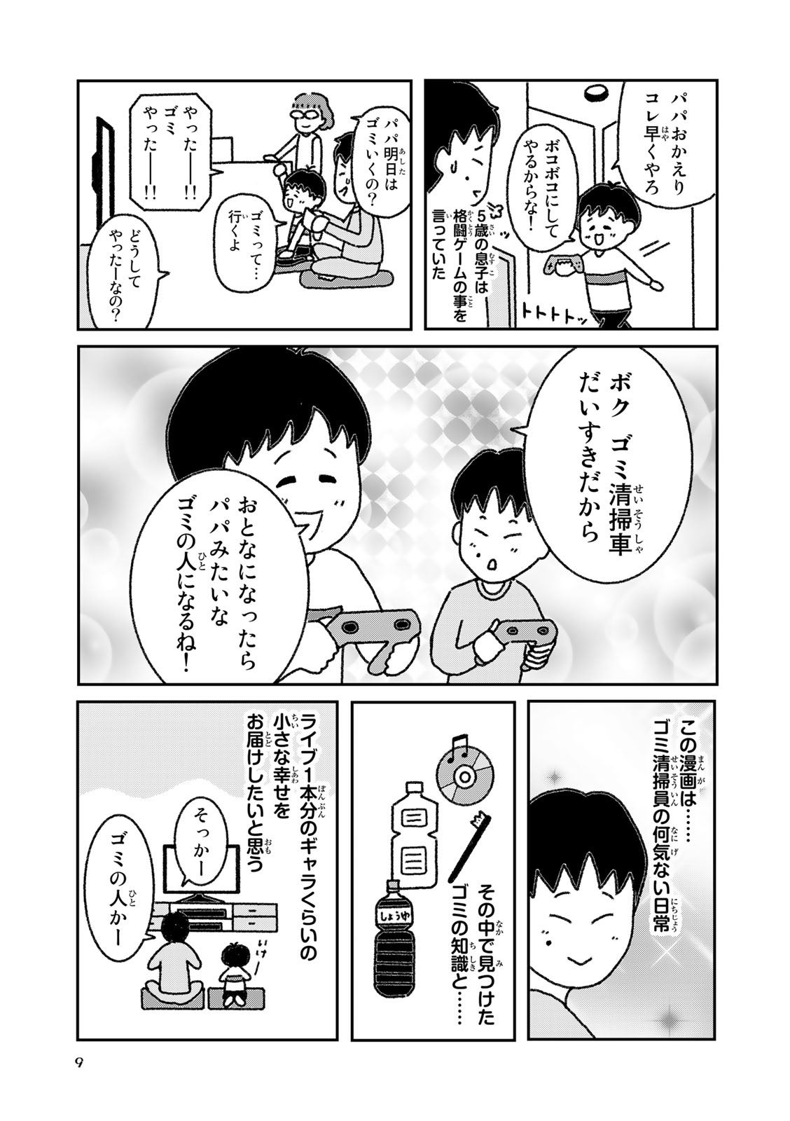 ゴミ清掃芸人・滝沢秀一が自身の経験をもとに、おもしろくて、ためになるゴミの話をつくり、まったくの素人の滝沢の妻がまんがにしました。