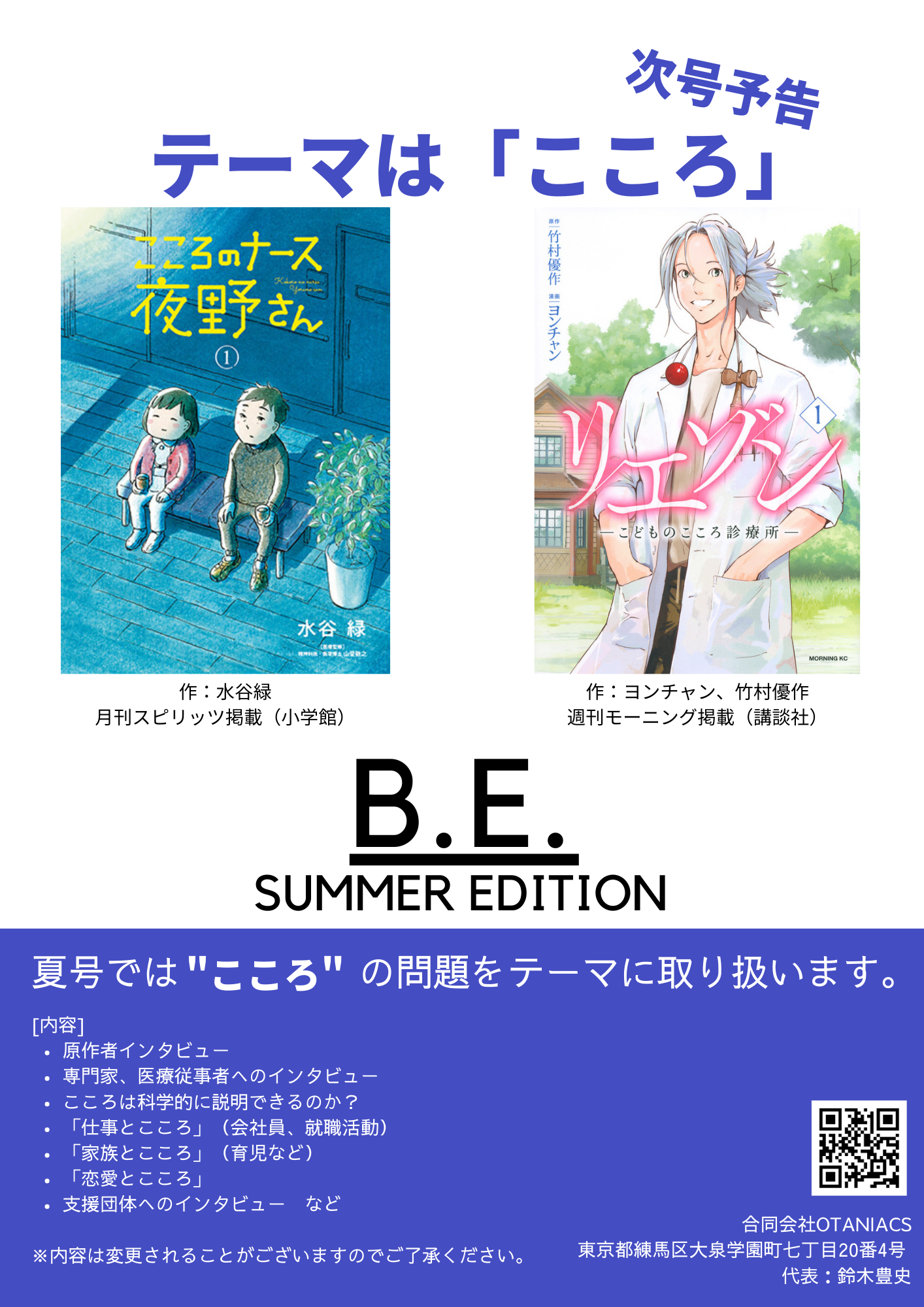 合同会社OTANIACS(本社:東京都練馬区、代表社員:鈴木豊史)が編集・発行する「全ての漫画好き読者に贈る、漫画を深く読むための副読本『B.E.(ビーイー)』」を4月1日から発売しております。