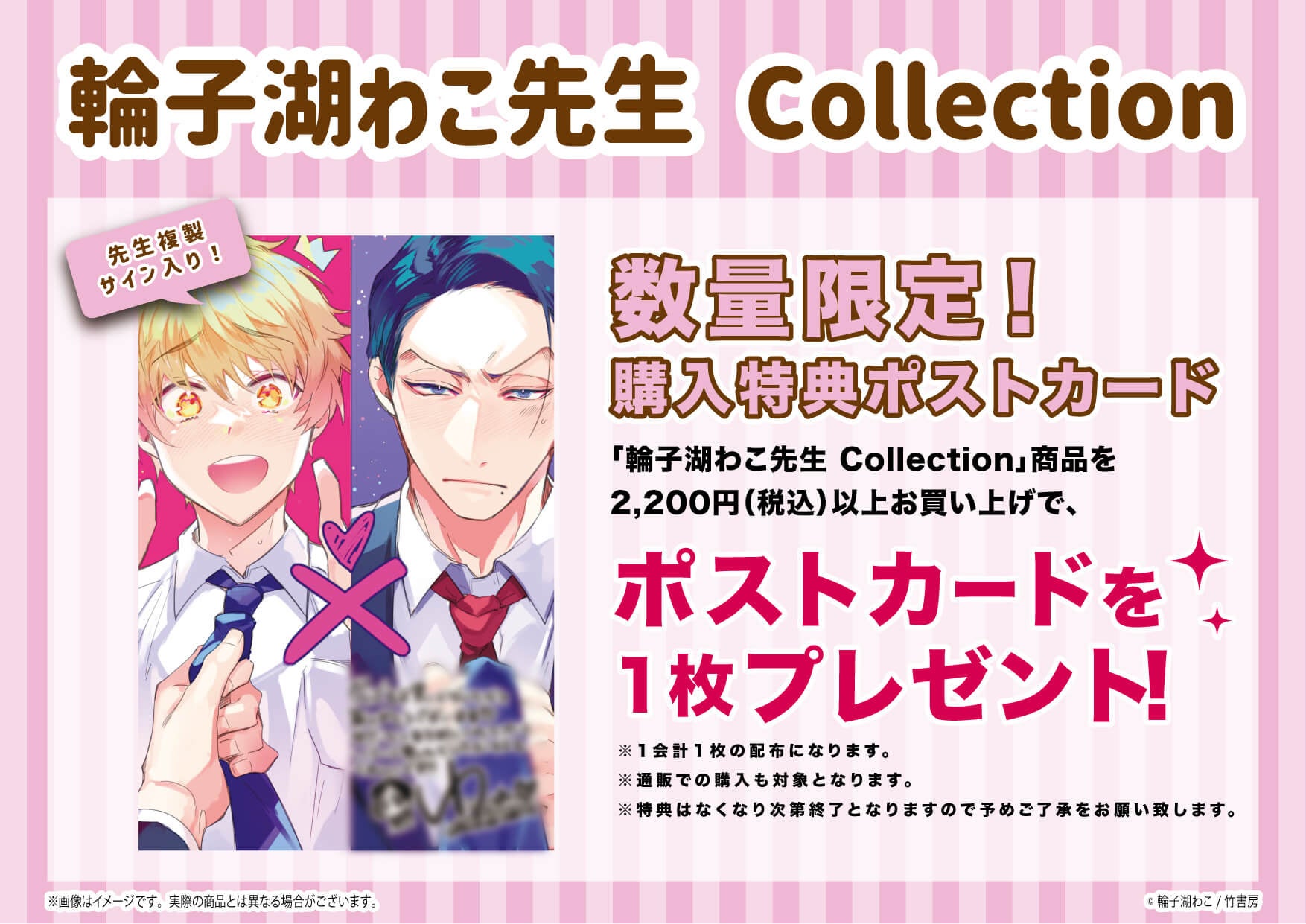 「輪子湖わこ先生 Collection」商品を1会計2,200円(税込)お買い上げで、購入特典ポストカードを1枚プレゼント。今回はなんと、わこ先生の複製サイン入りです!