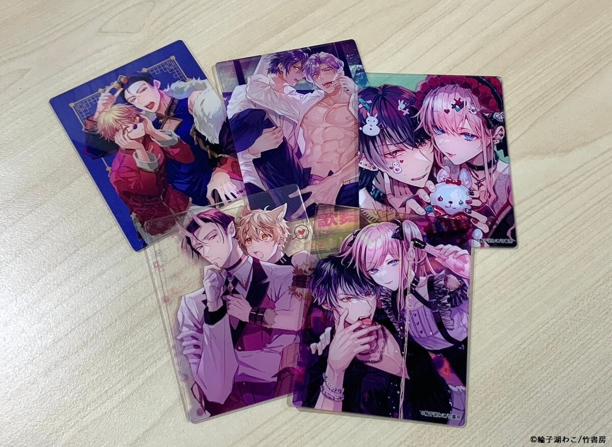 バチバチの色合い&透け感が可愛すぎる、約7×9cmのアクリルカード。『絶倫プリンシパル』の中野くん&本郷社長も加わり、雄受たちの魅惑的な表情と肉体美にドキドキが止まりません……!