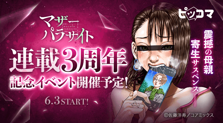 『マザーパラサイト』(コアミックス)の連載3周年を祝して、最新話先行配信、無料話増量、1日最大13話無料閲覧が可能となる「¥0+」など記念イベントを実施いたします。