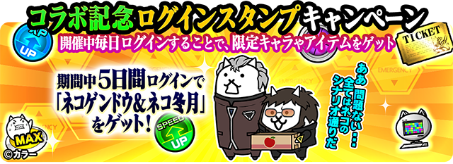 5日間ログインでコラボ限定EXキャラクター「ネコゲンドウ&ネコ冬月」を入手できます。