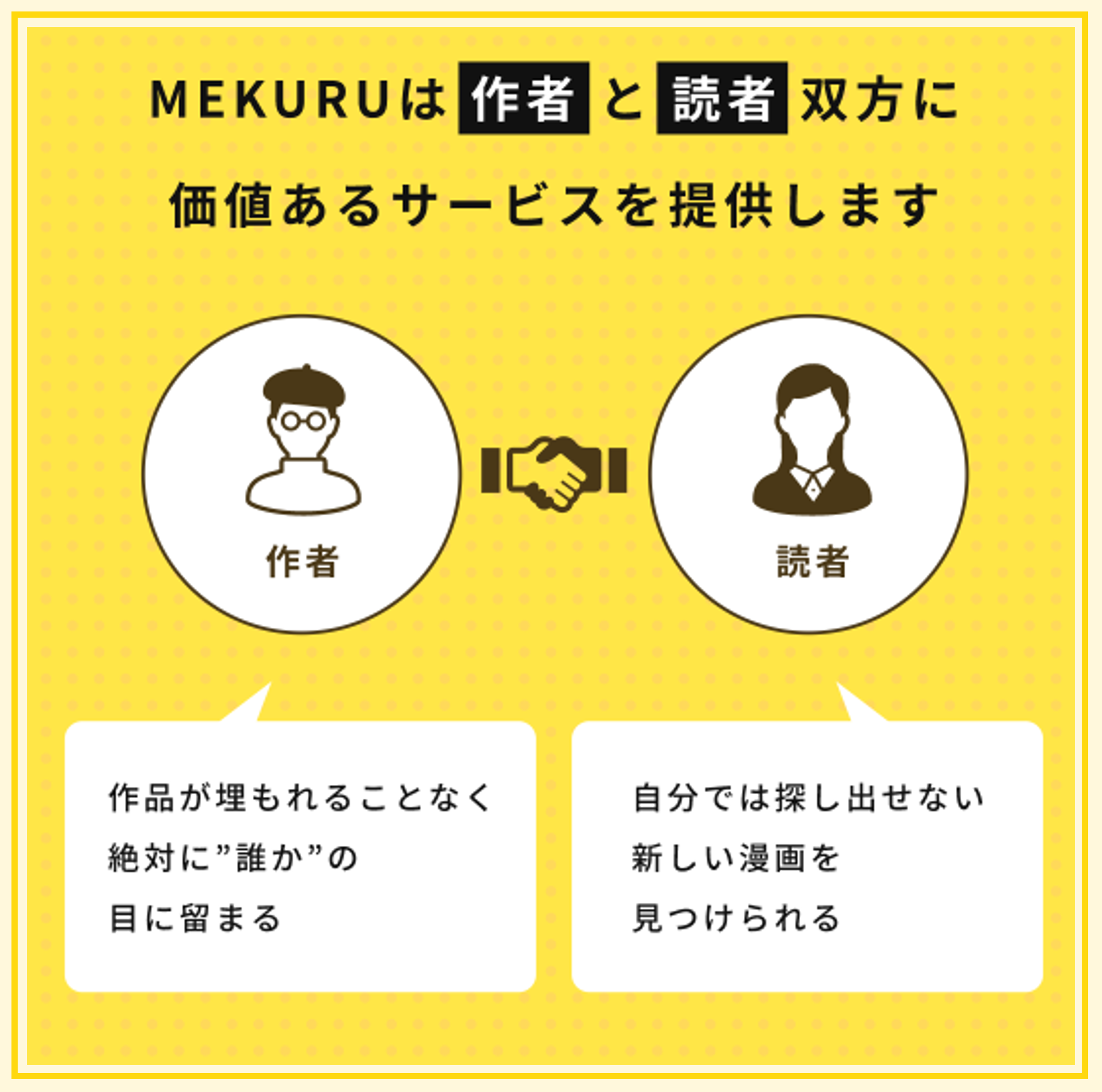 誰もがクリエイターを名乗り自由に発信できる時代のため、多くの名作マンガがネットの海に埋もれてしまっています。全ての作品が露出される「MEKURU」では、知名度や作家歴は関係ありません。あなたのマンガを求めている誰かに、必ず出会えます。