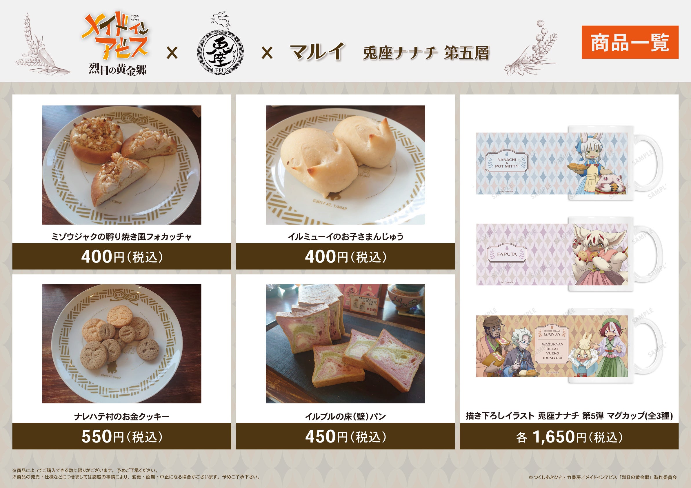 「ベーカリー兎座LEPUS」ではイベント限定コラボパンの販売を行い、「新宿マルイ メン」ではアビスの深界にある「ベーカリー兎座LEPUS」でコラボパン作りを楽しんでいる「ナナチ」をはじめとする、作品登場キャラクター達の描き下ろしイラストグッズを多数ご用意しております。期間中、描き下ろしイラストを使用した商品の先行販売を始め、イベント限定購入特典の配布など盛りだくさんのイベントとなっております。
