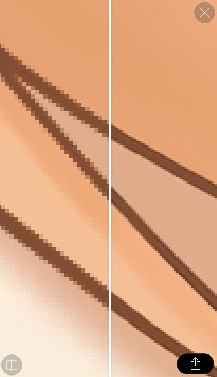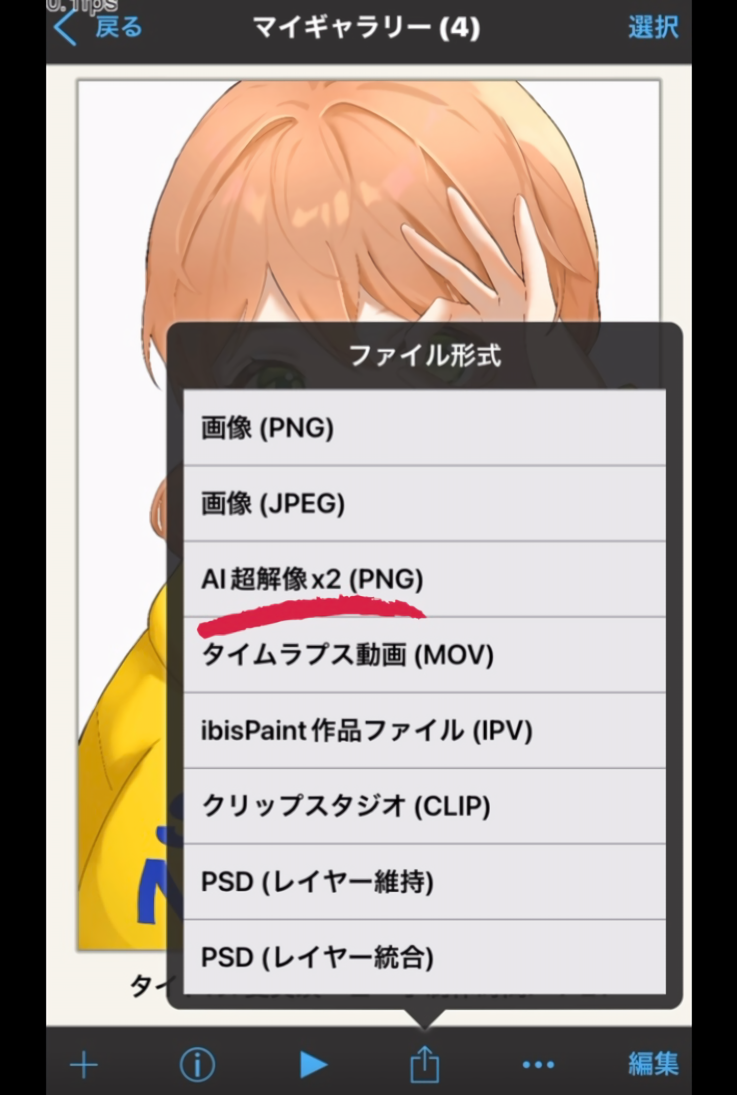 「AI超解像度機能」は、ディープラーニングの技術を駆使し、自身が描いたイラスト作品の高画質化をワンタップで実現します。保存された画像の画質とサイズを2倍に向上させることができるこの機能では、仕切りバーを使って適用前後の解像度の比較を容易に行うことができます。