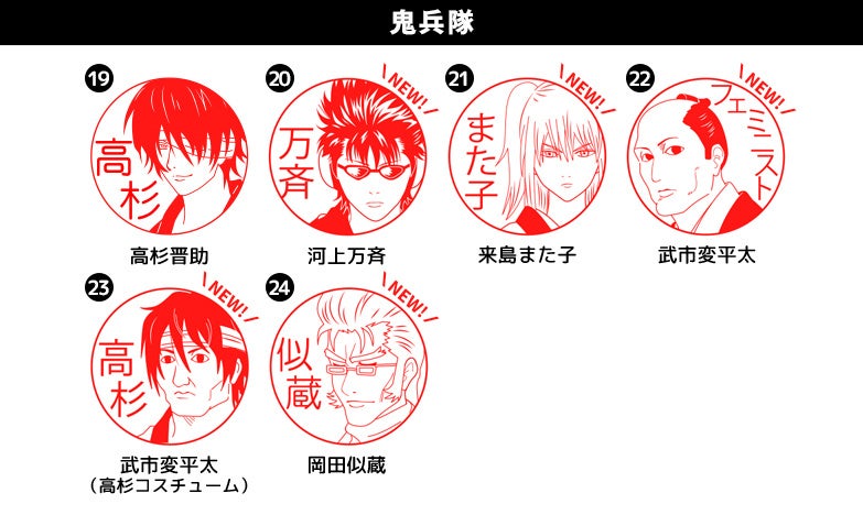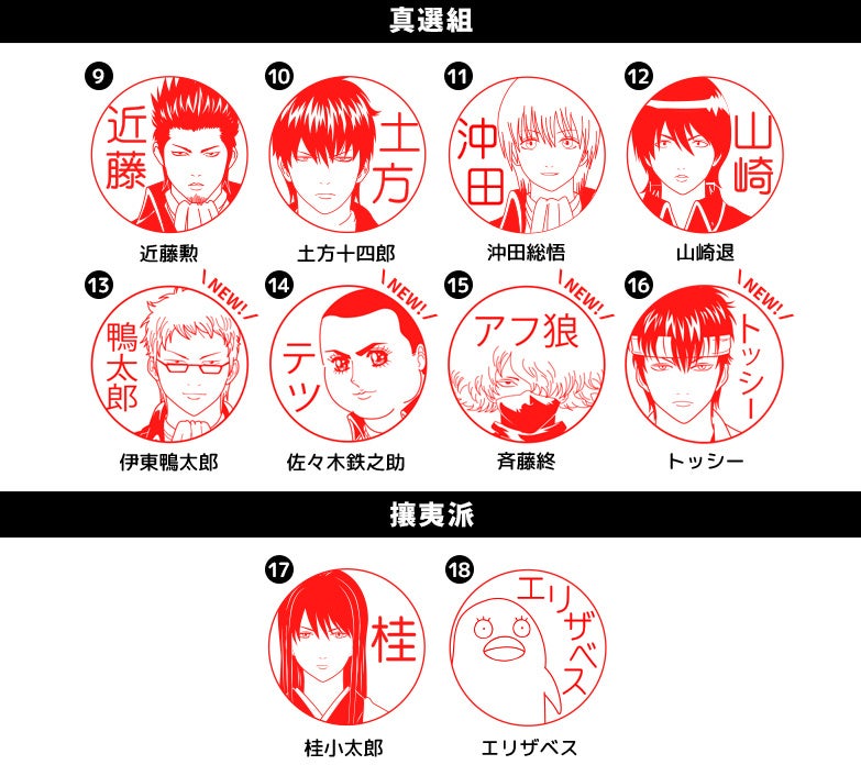 主人公の坂田銀時や志村新八、神楽、定春などこれまでの31キャラクターに加えて、真選組からは参謀である伊東鴨太郎、鬼兵隊からは河上万斉と岡田似蔵、来島また子、武市変平太が、見廻組からは佐々木異三郎と今井信女、その他にも平賀源外や徳川茂茂(将軍)など18キャラクターが追加。合計49種類となりました。