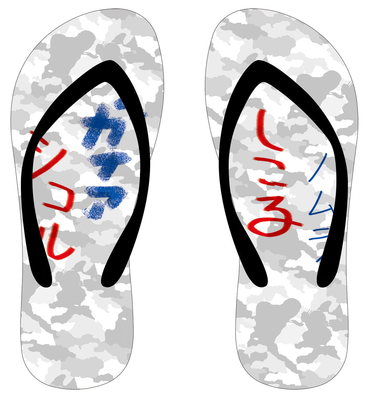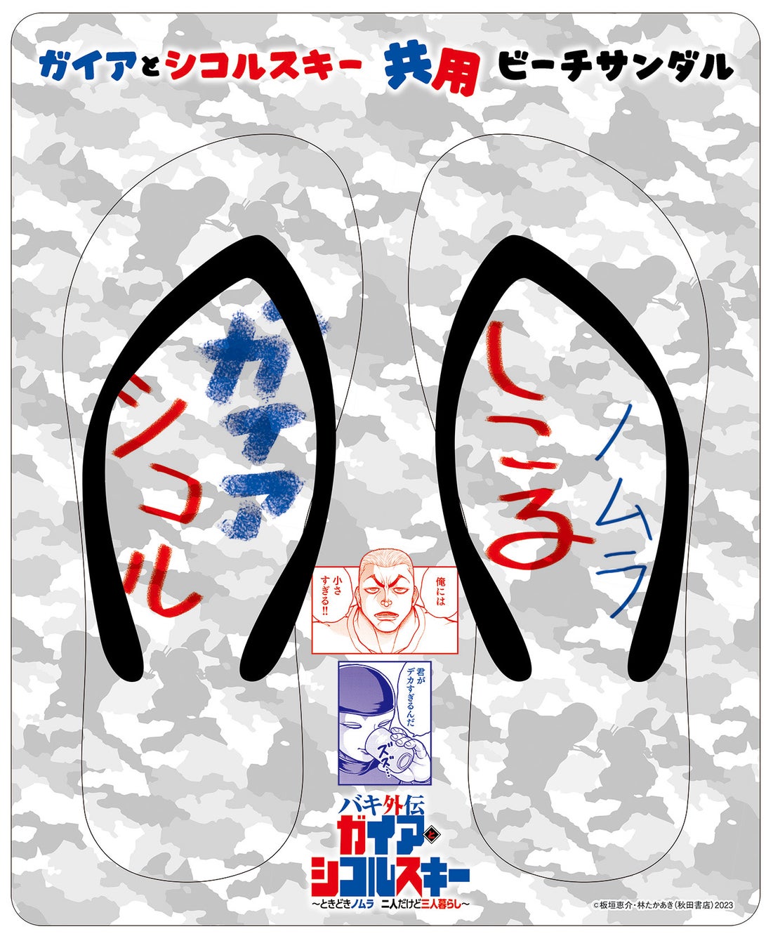 この2タイトル同時発売を記念して、「ガイアとシコルスキー」共用ビーチサンダルが20名に当たる特別キャンペーンを実施。「玄関も狭いのでいっぱい履物を置くわけにもいかないし、ちょっと外に出るときはこのサンダルを共用しよう」とガイアからの提案で用意されたかもしれないサンダルを再現!! 互いの名前もしっかり入っているが、サイズはシコルスキーには少し小さい27cm!!