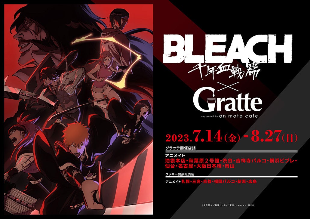 アニメイトカフェグラッテではタイトルによって注文特典や有償特典がついてくるものもあります。また、グランドオープン日の7月14日から8月27日まで、世界中で根強い人気を誇り、TVアニメの第2クールが7月から放送される『BLEACH 千年血戦篇』とのコラボを実施いたします。